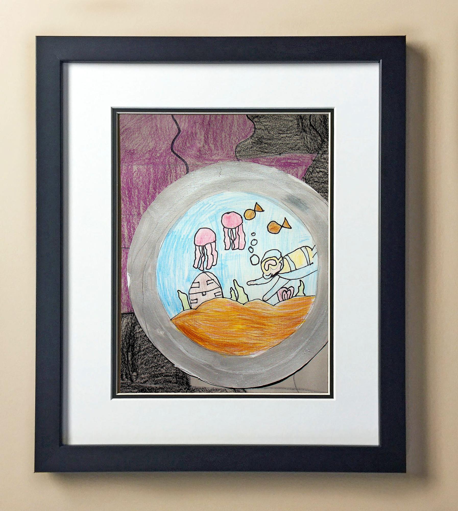 Included with the purchase is the Students Artwork, Frame, double matboard, shatter proof plexiglass, and a ready to hang backerboard with turnbuttons
