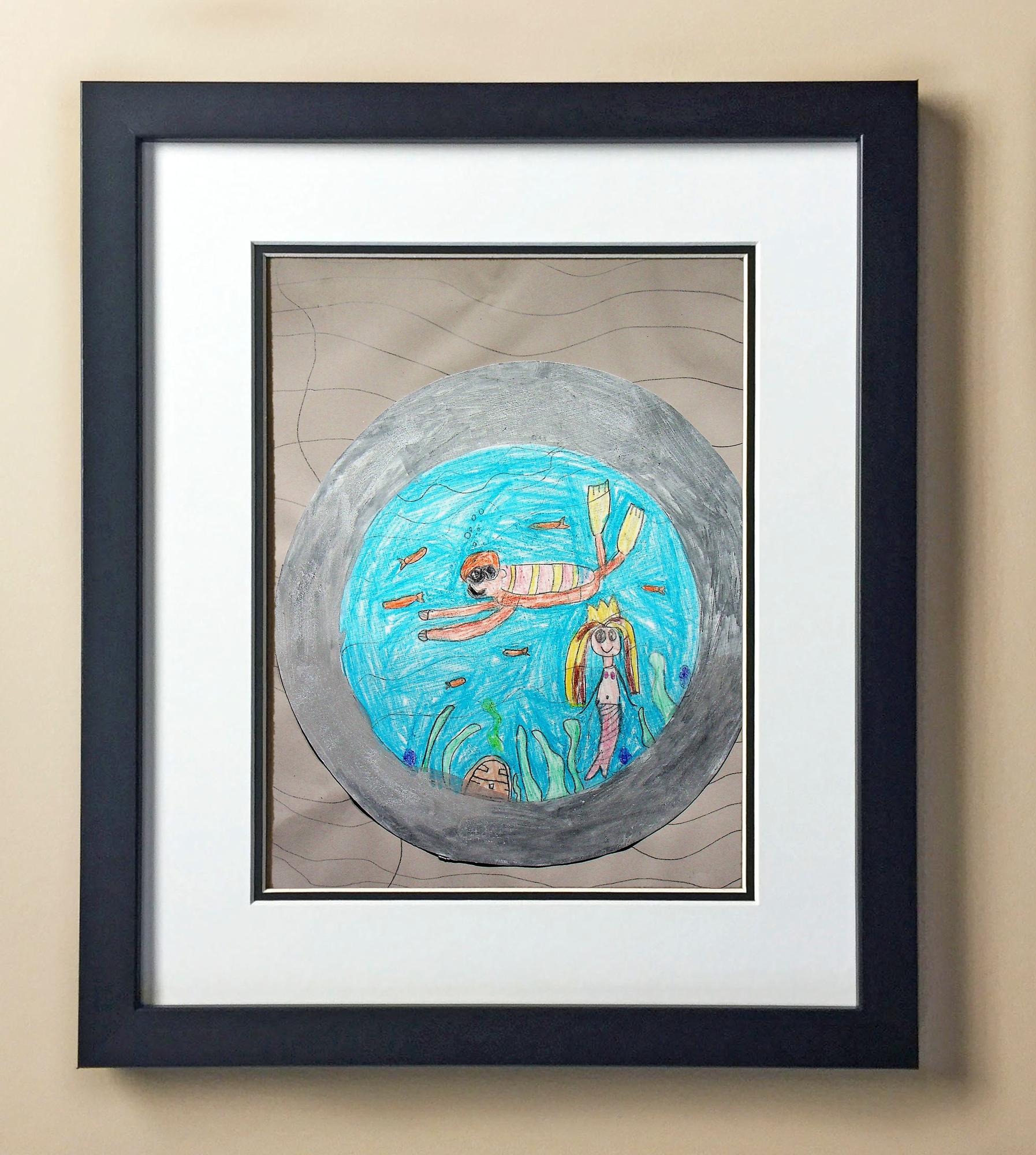 Included with the purchase is the Students Artwork, Frame, double matboard, shatter proof plexiglass, and a ready to hang backerboard with turnbuttons