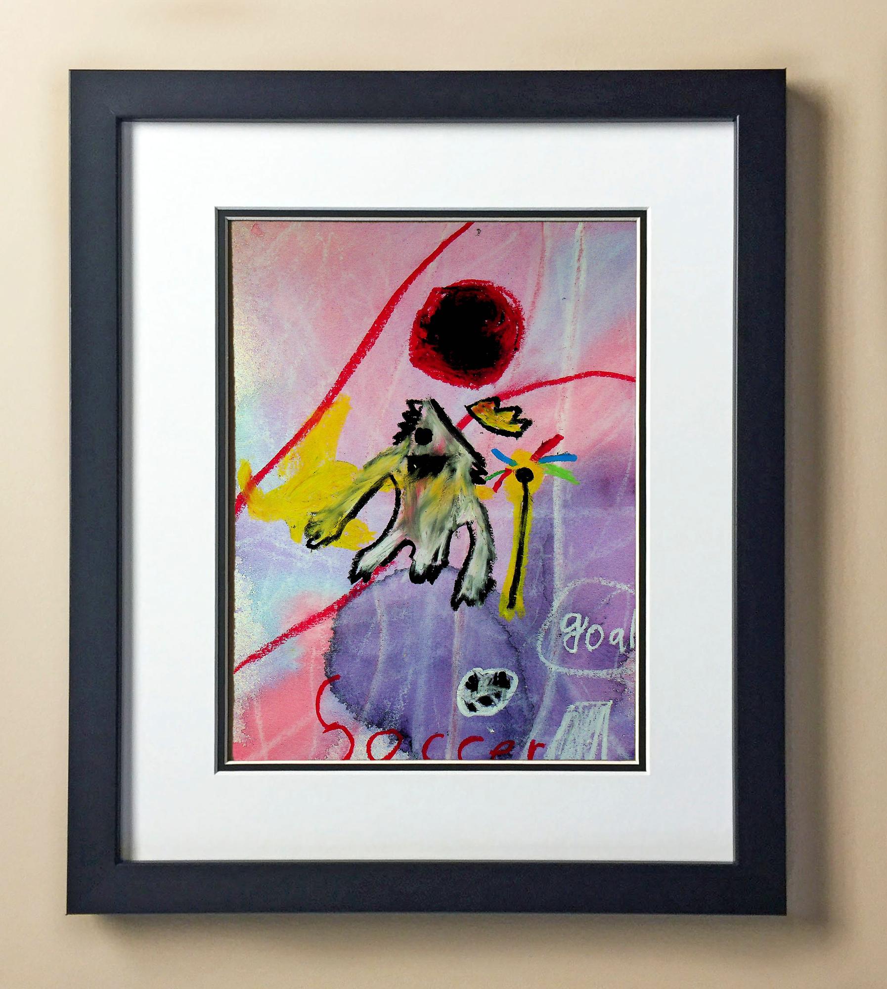 Included with the purchase is the Students Artwork, Frame, double matboard, shatter proof plexiglass, and a ready to hang backerboard with turnbuttons