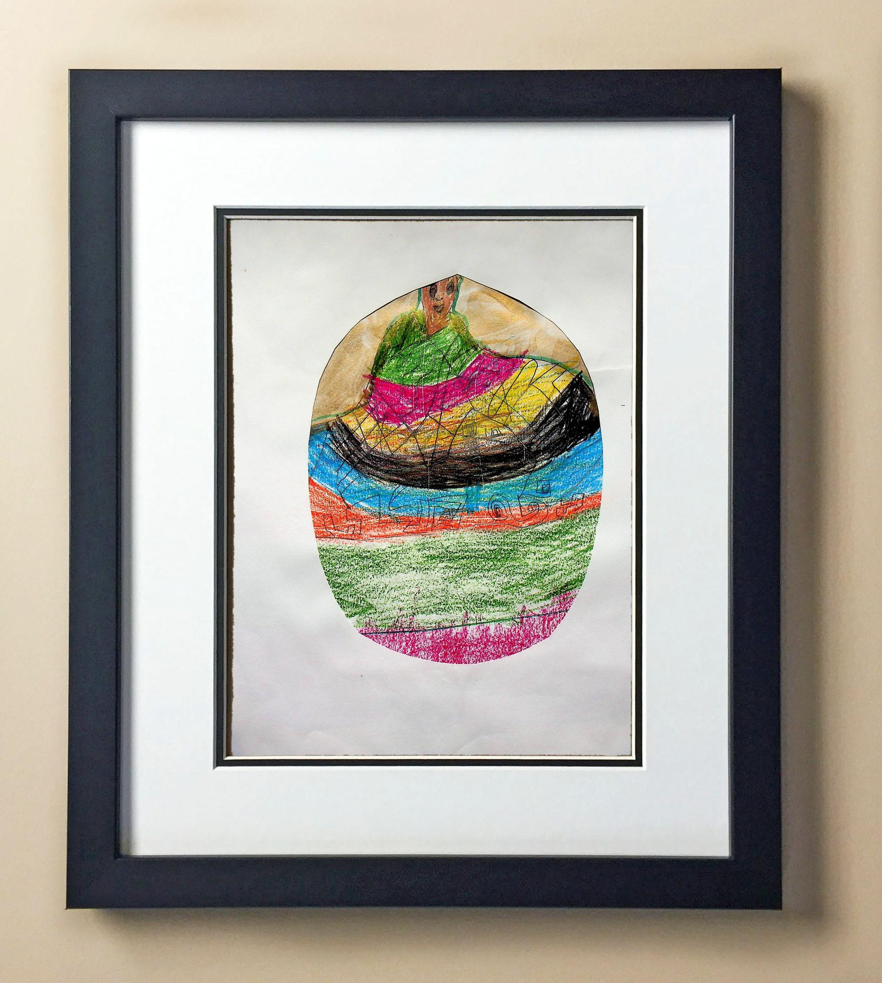 Included with the purchase is the Students Artwork, Frame, double matboard, shatter proof plexiglass, and a ready to hang backerboard with turnbuttons