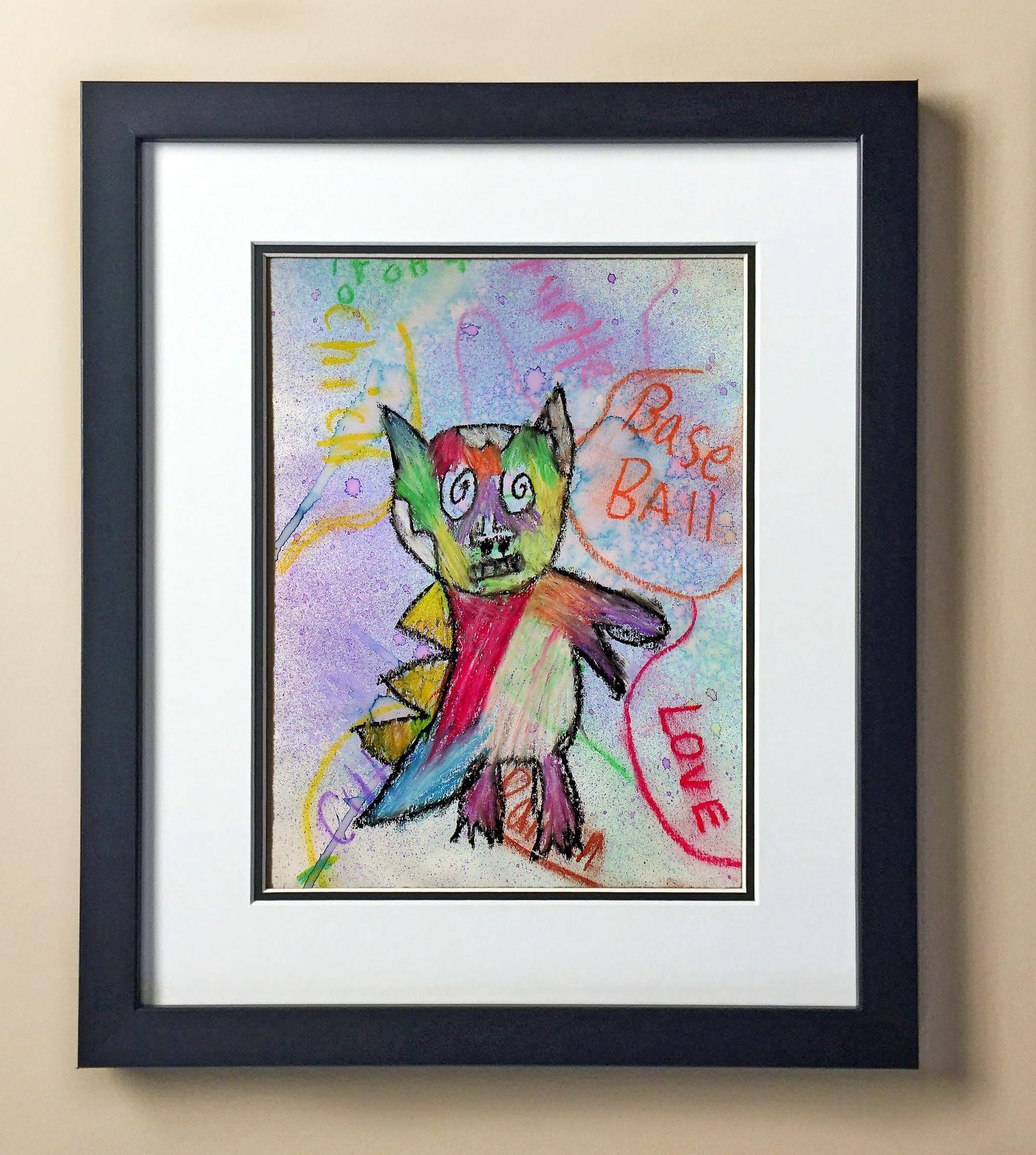 Included with the purchase is the Students Artwork, Frame, double matboard, shatter proof plexiglass, and a ready to hang backerboard with turnbuttons