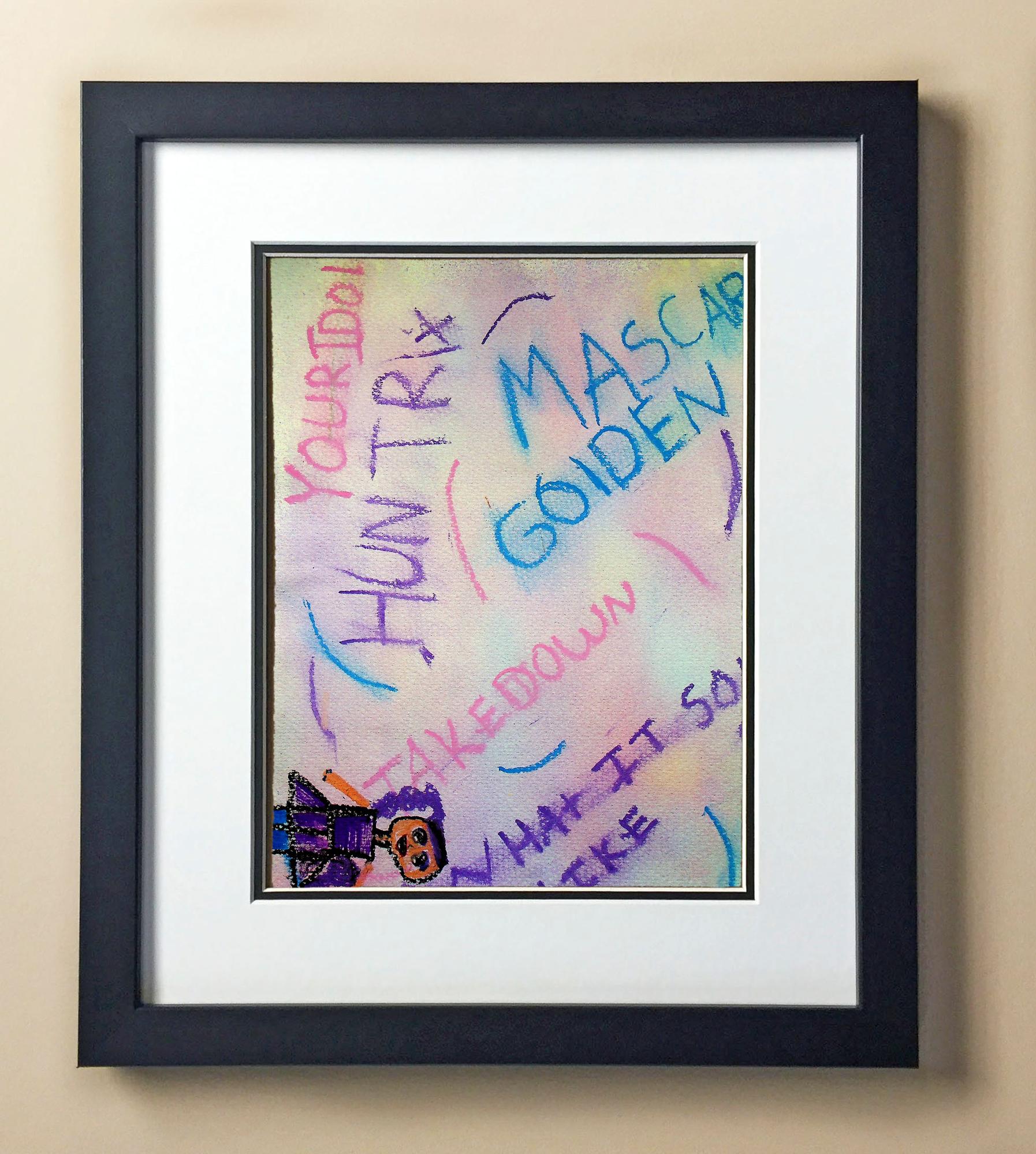 Included with the purchase is the Students Artwork, Frame, double matboard, shatter proof plexiglass, and a ready to hang backerboard with turnbuttons