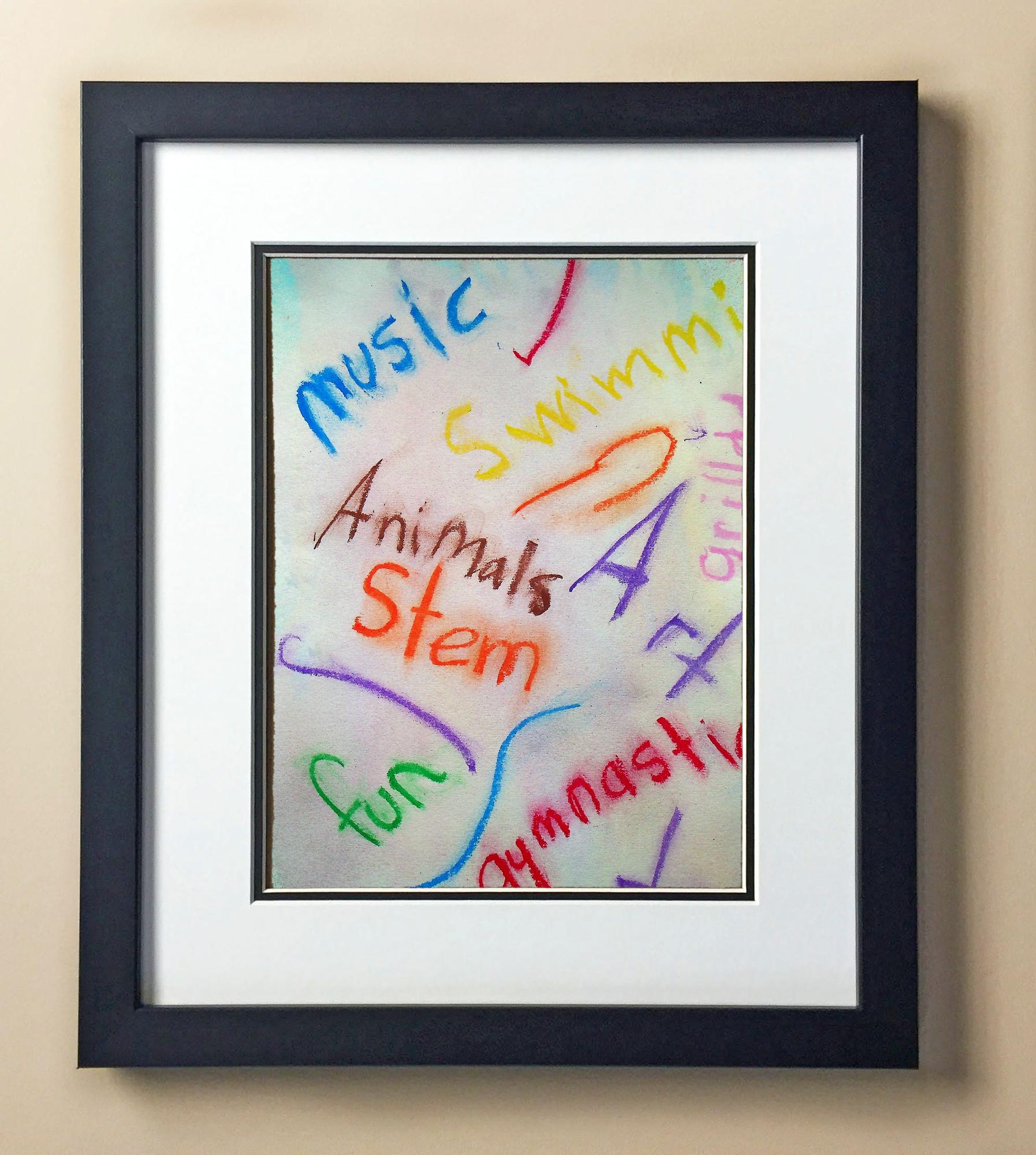 Included with the purchase is the Students Artwork, Frame, double matboard, shatter proof plexiglass, and a ready to hang backerboard with turnbuttons
