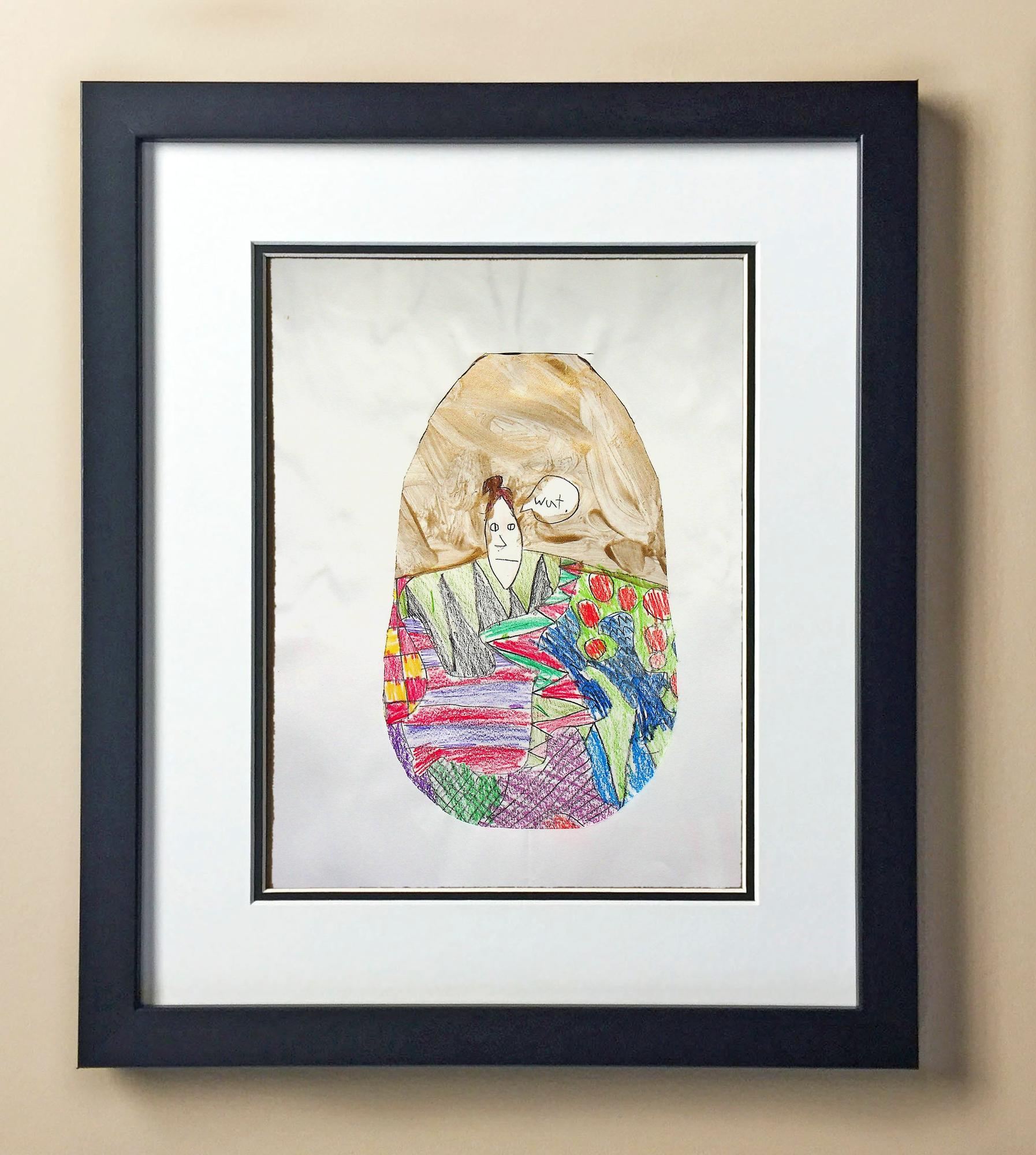 Included with the purchase is the Students Artwork, Frame, double matboard, shatter proof plexiglass, and a ready to hang backerboard with turnbuttons