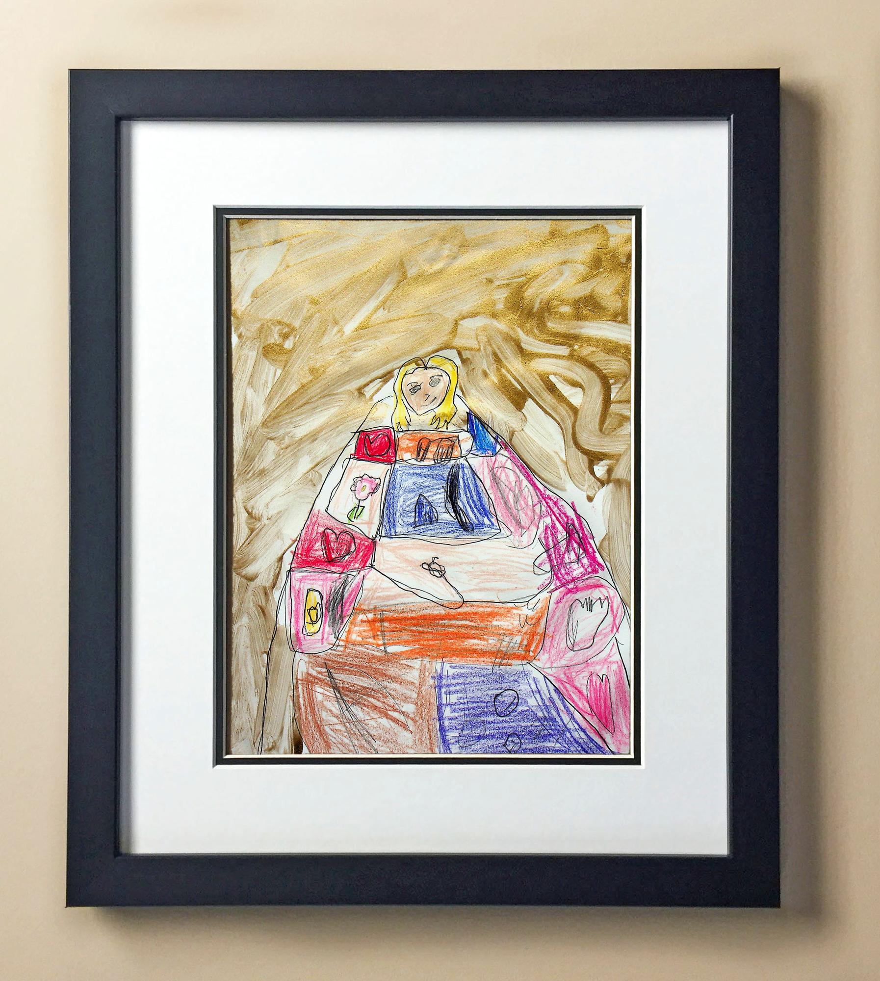 Included with the purchase is the Students Artwork, Frame, double matboard, shatter proof plexiglass, and a ready to hang backerboard with turnbuttons
