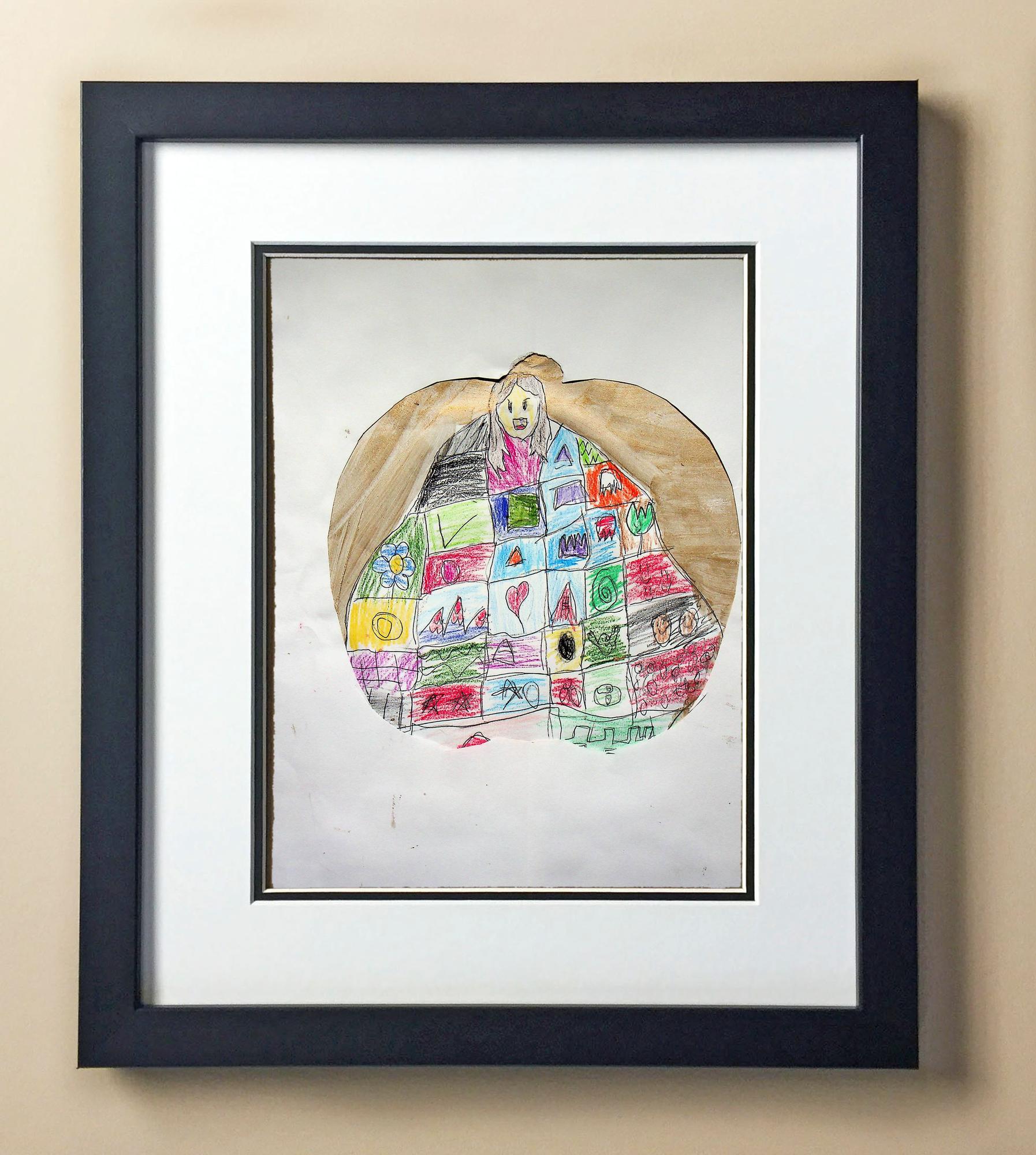Included with the purchase is the Students Artwork, Frame, double matboard, shatter proof plexiglass, and a ready to hang backerboard with turnbuttons