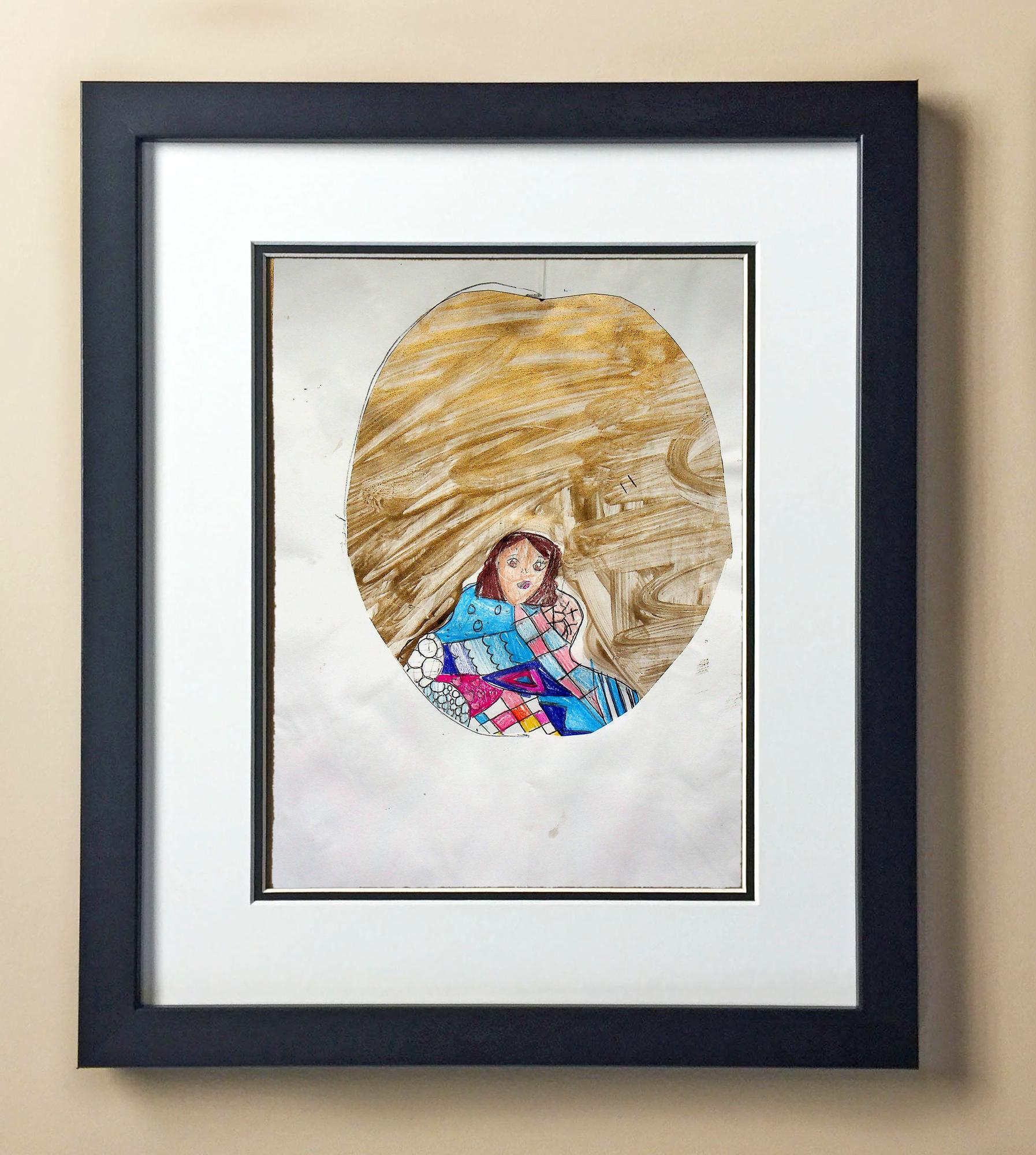Included with the purchase is the Students Artwork, Frame, double matboard, shatter proof plexiglass, and a ready to hang backerboard with turnbuttons