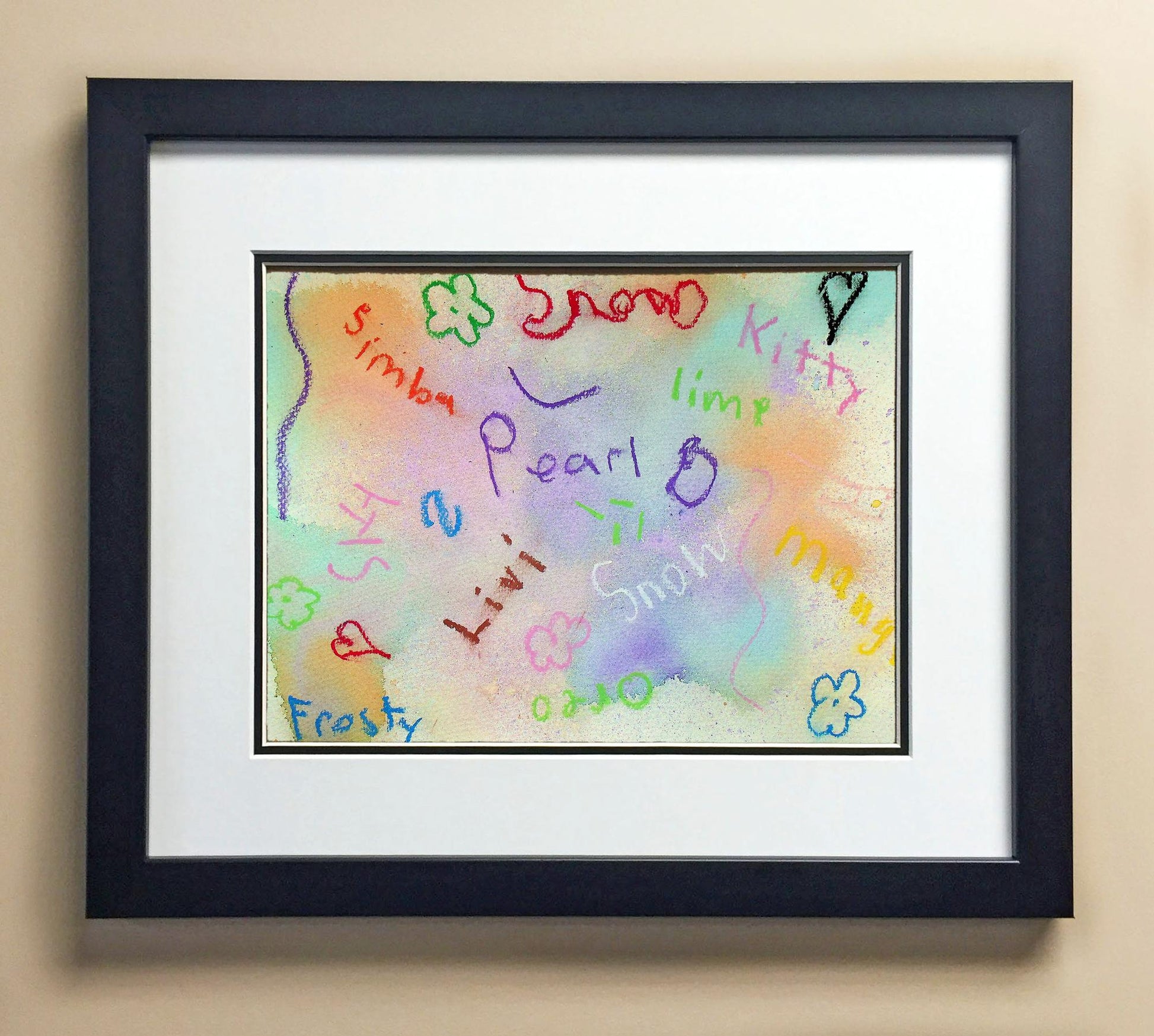 Included with the purchase is the Students Artwork, Frame, double matboard, shatter proof plexiglass, and a ready to hang backerboard with turnbuttons