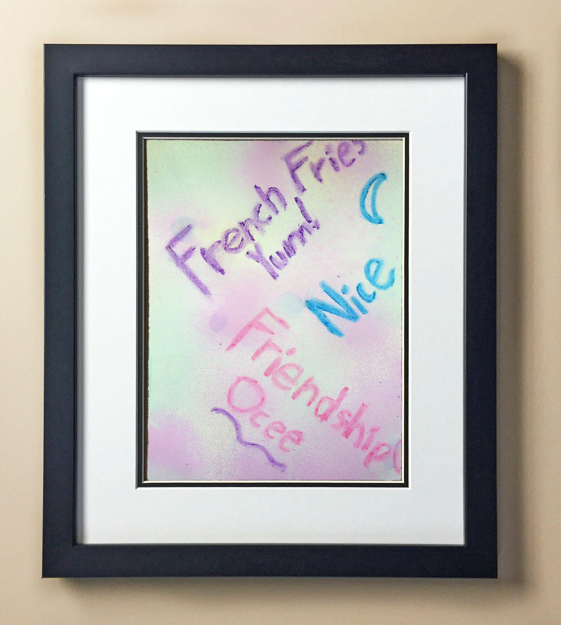 Included with the purchase is the Students Artwork, Frame, double matboard, shatter proof plexiglass, and a ready to hang backerboard with turnbuttons