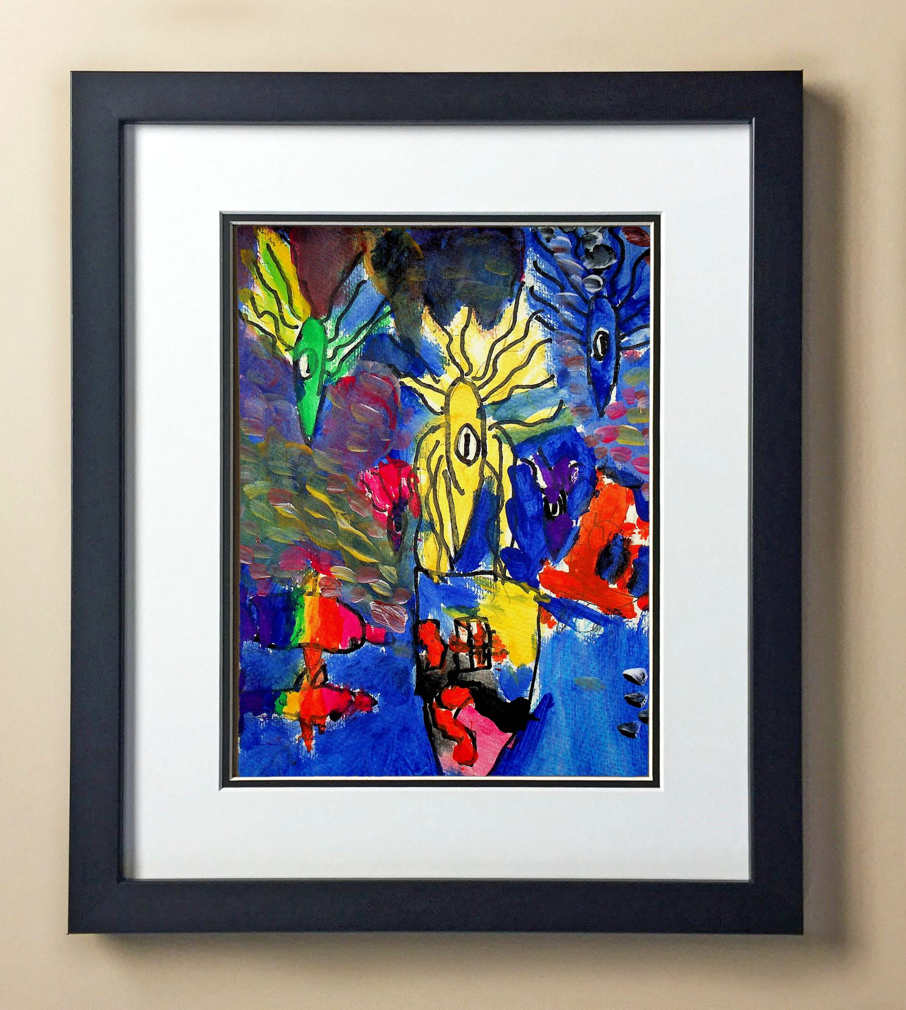 Included with the purchase is the Students Artwork, Frame, double matboard, shatter proof plexiglass, and a ready to hang backerboard with turnbuttons
