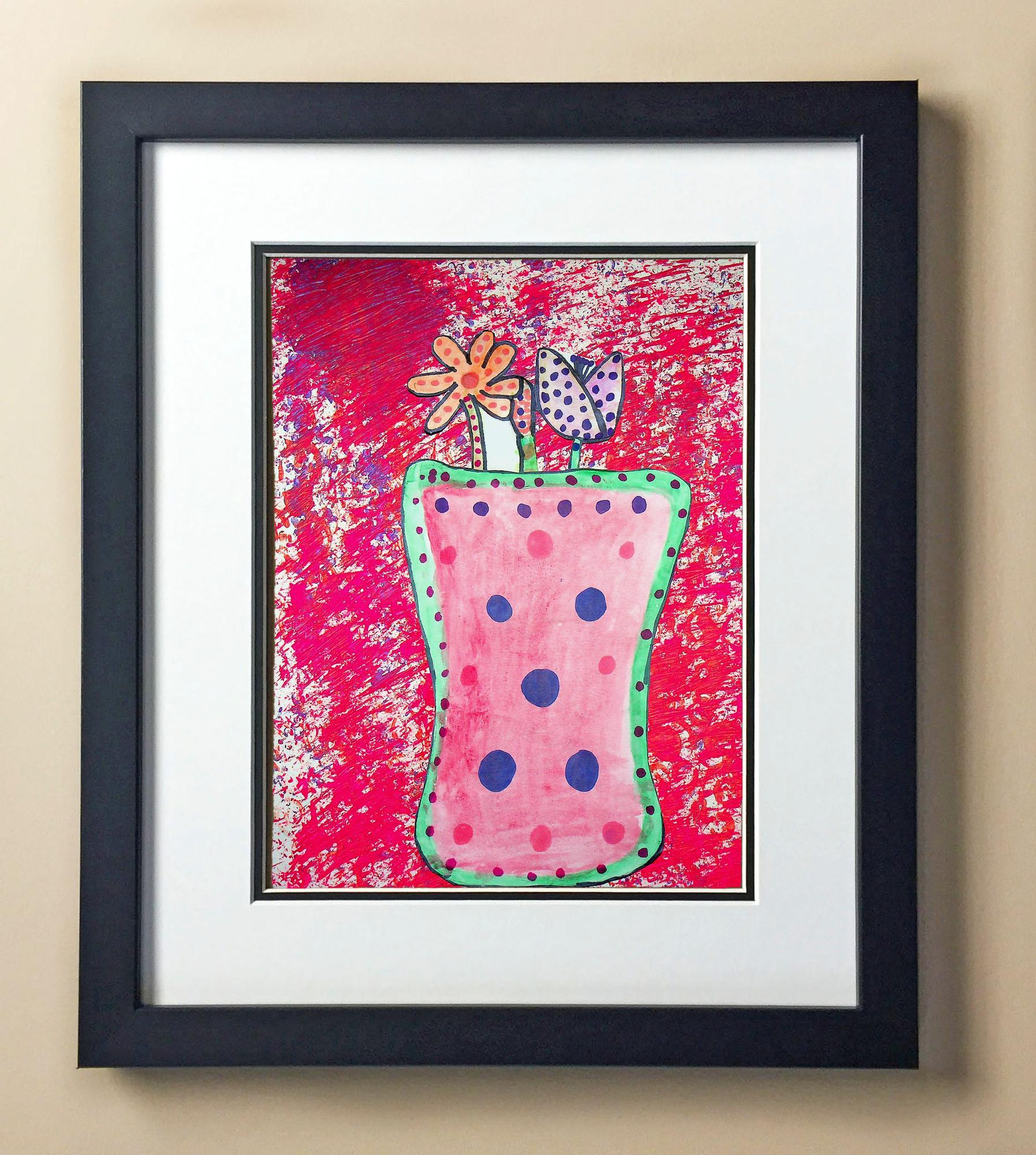 Included with the purchase is the Students Artwork, Frame, double matboard, shatter proof plexiglass, and a ready to hang backerboard with turnbuttons