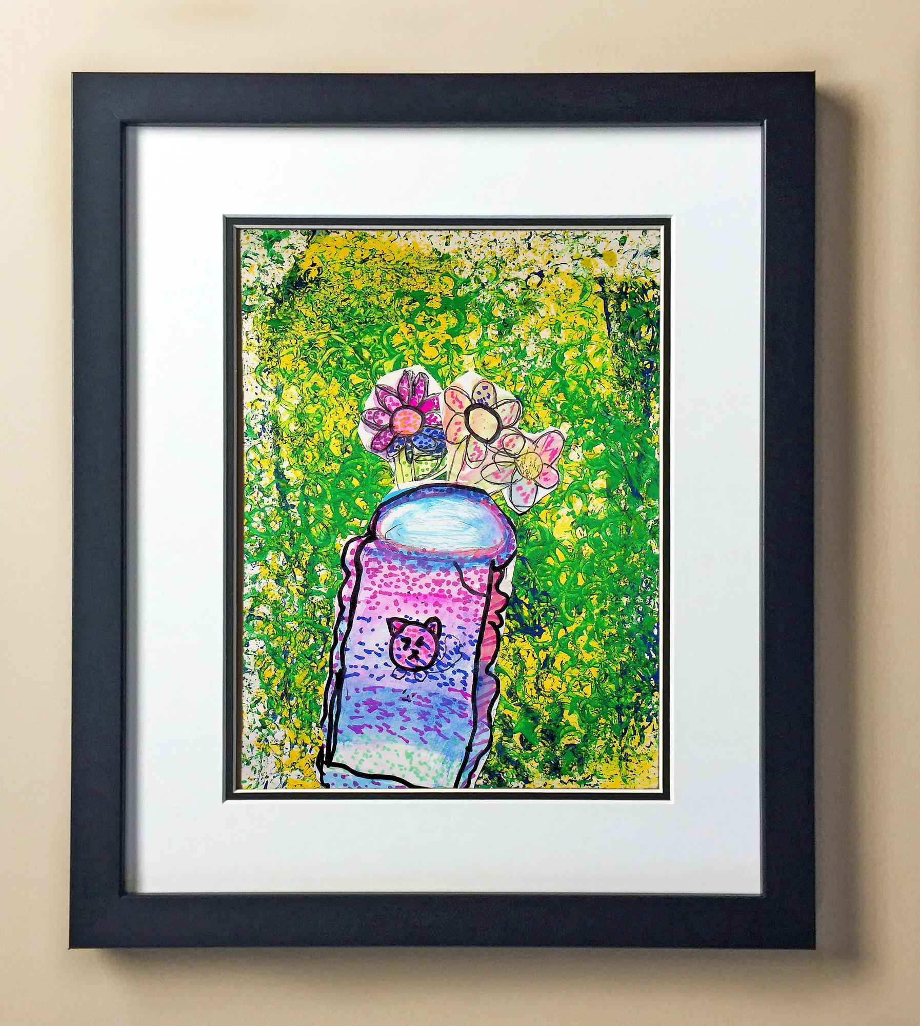 Included with the purchase is the Students Artwork, Frame, double matboard, shatter proof plexiglass, and a ready to hang backerboard with turnbuttons