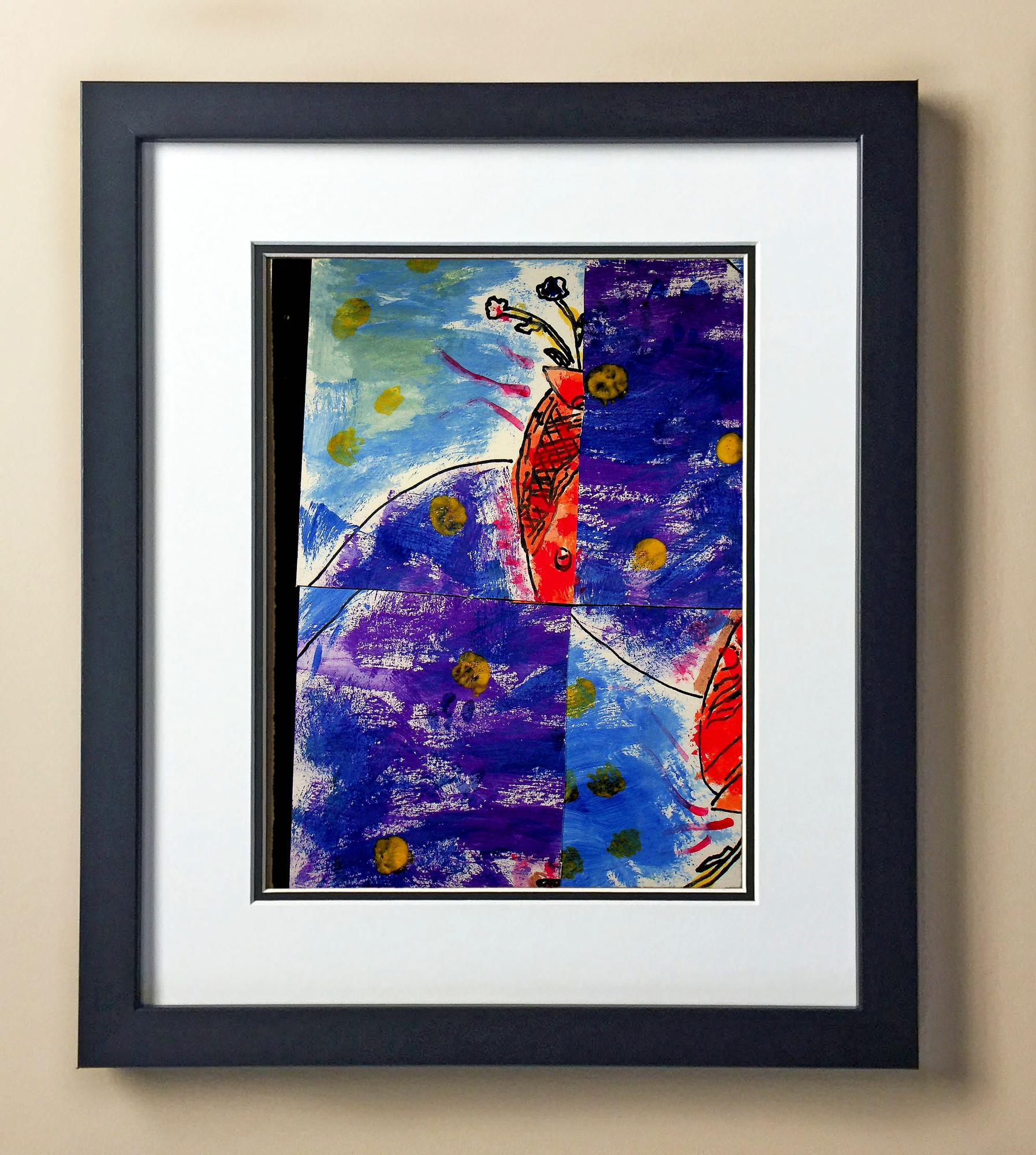 Included with the purchase is the Students Artwork, Frame, double matboard, shatter proof plexiglass, and a ready to hang backerboard with turnbuttons