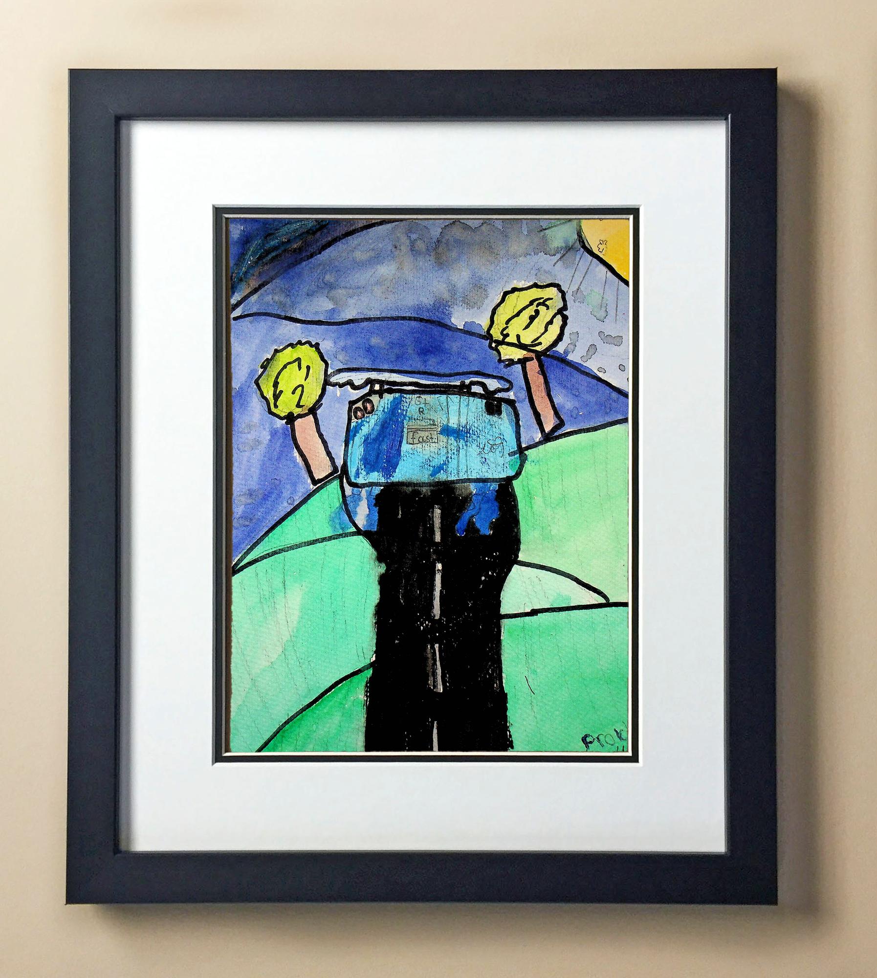 Included with the purchase is the Students Artwork, Frame, double matboard, shatter proof plexiglass, and a ready to hang backerboard with turnbuttons