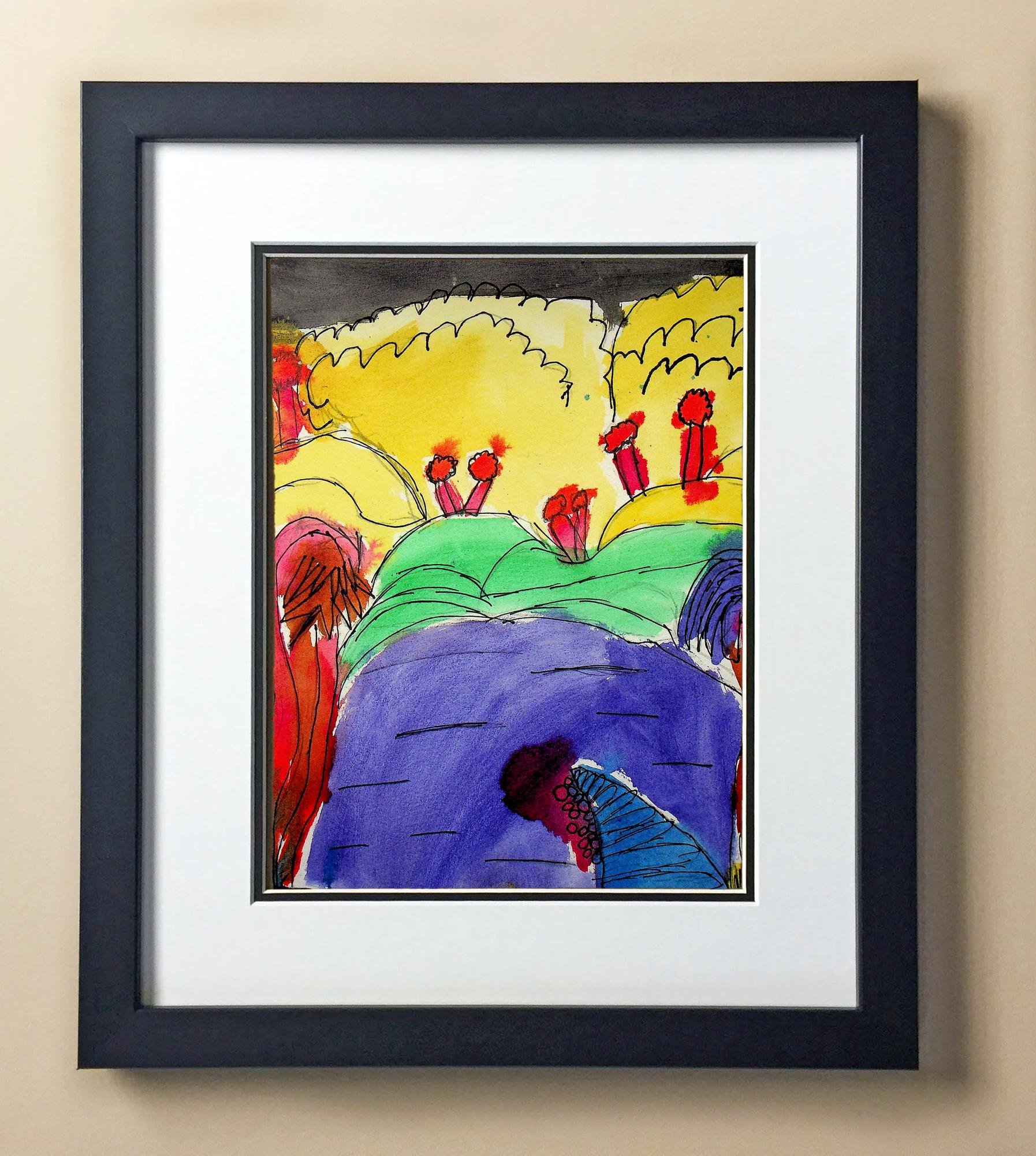 Included with the purchase is the Students Artwork, Frame, double matboard, shatter proof plexiglass, and a ready to hang backerboard with turnbuttons