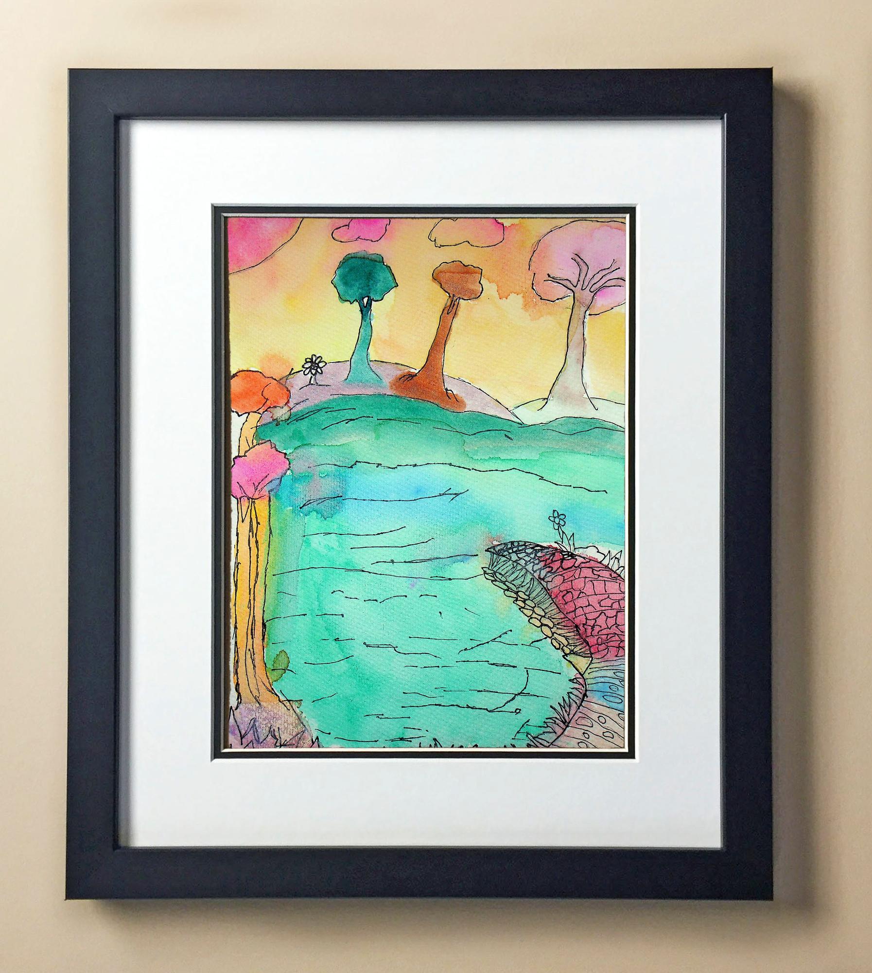 Included with the purchase is the Students Artwork, Frame, double matboard, shatter proof plexiglass, and a ready to hang backerboard with turnbuttons