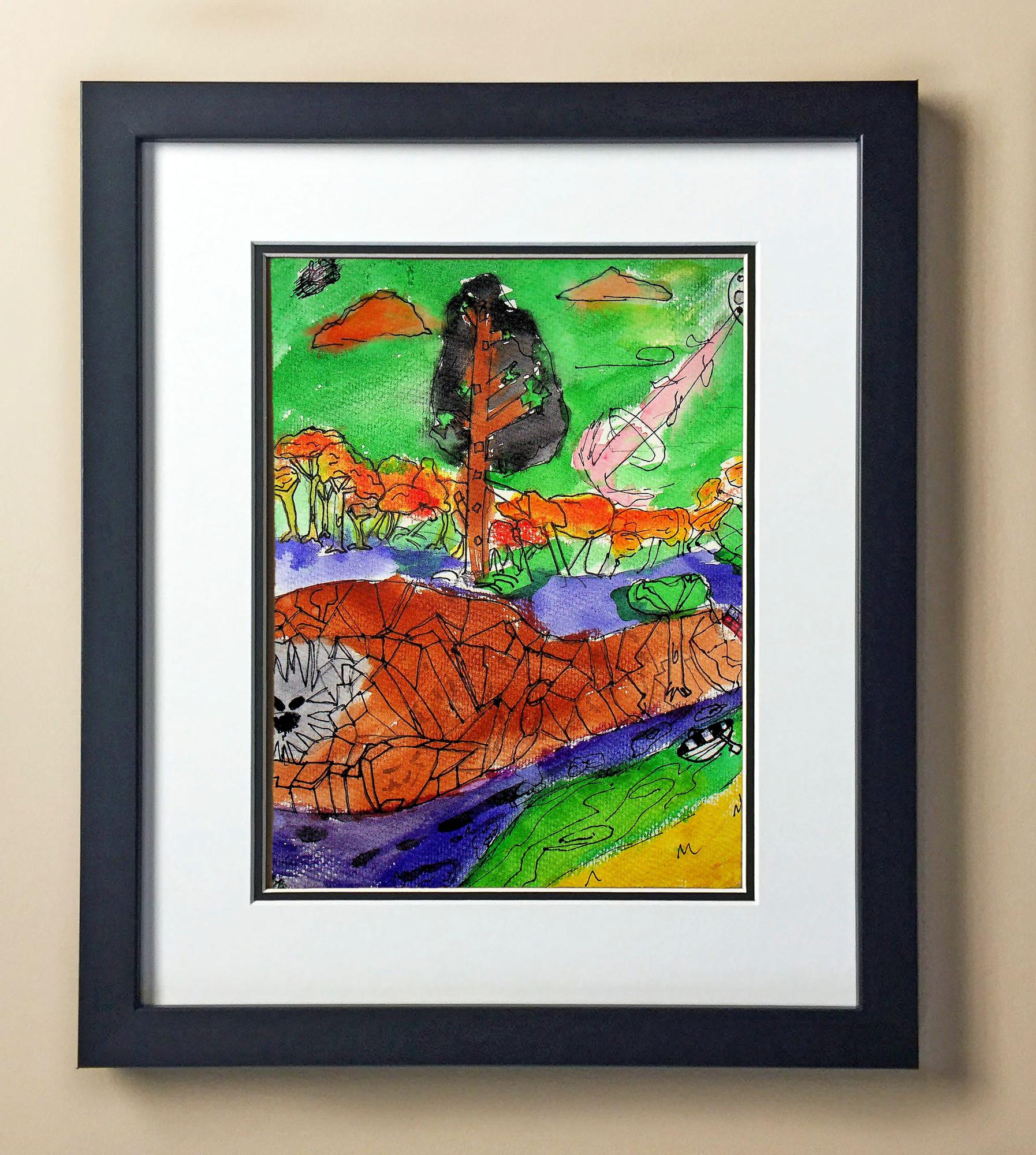 Included with the purchase is the Students Artwork, Frame, double matboard, shatter proof plexiglass, and a ready to hang backerboard with turnbuttons