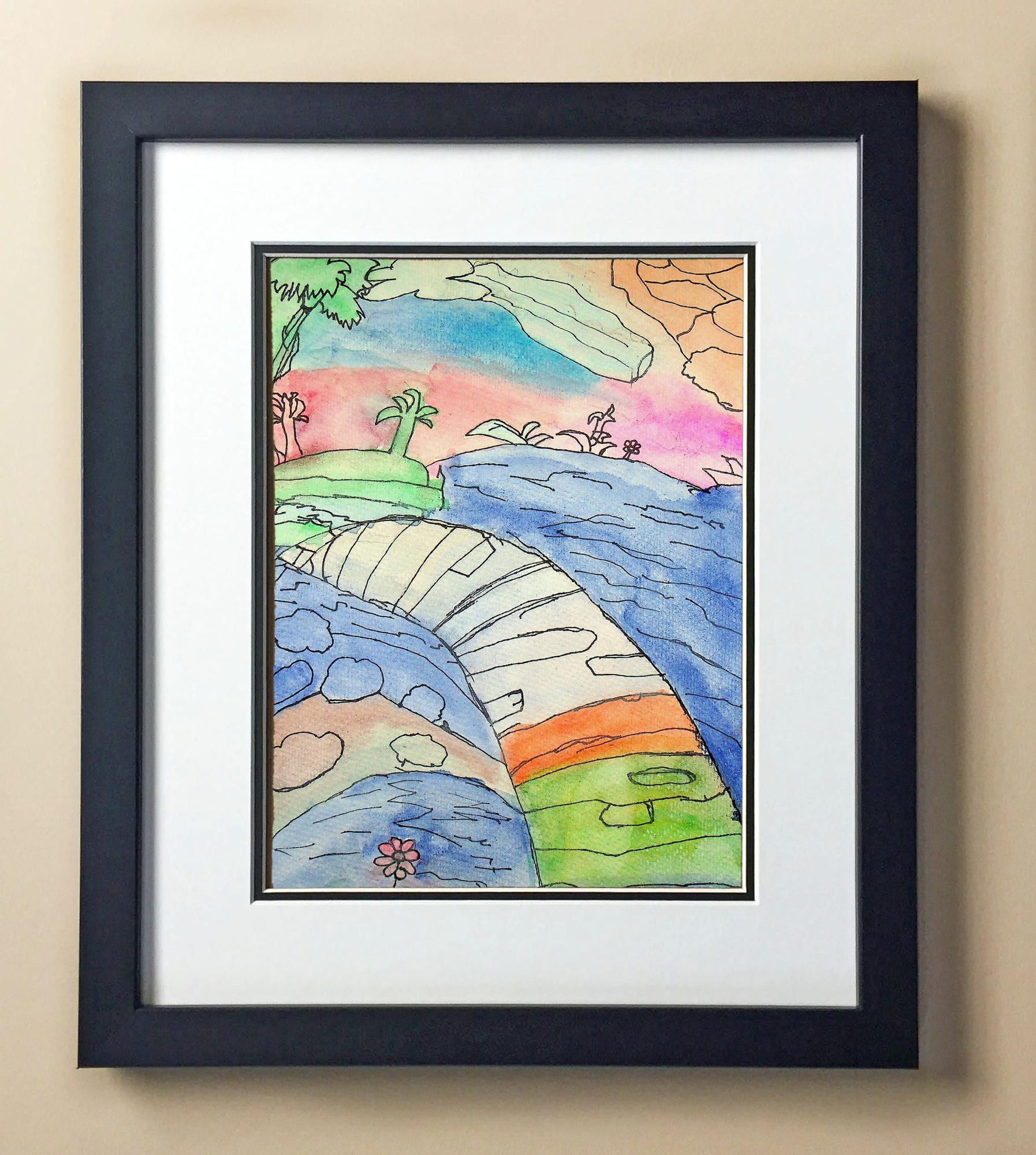 Included with the purchase is the Students Artwork, Frame, double matboard, shatter proof plexiglass, and a ready to hang backerboard with turnbuttons