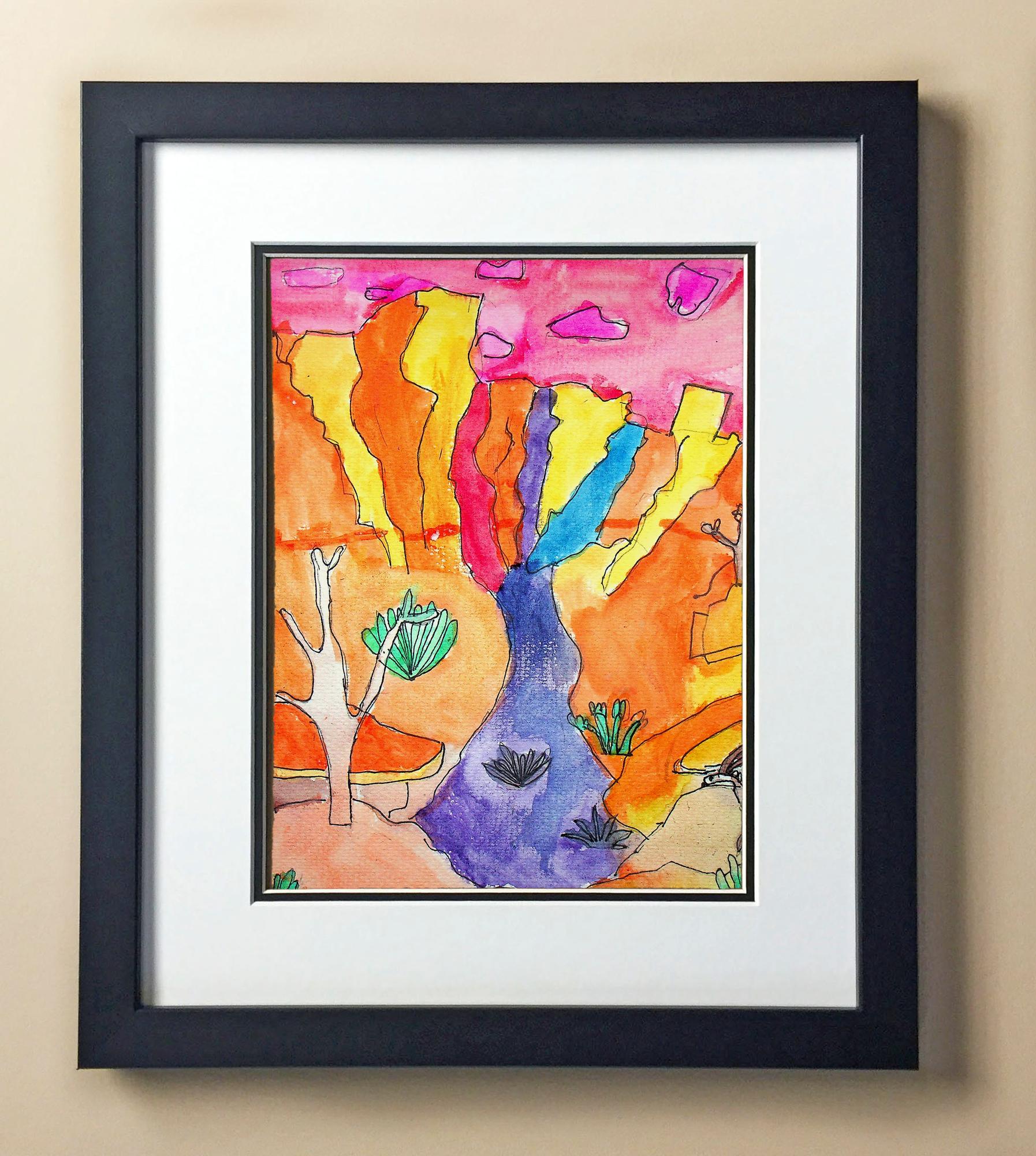 Included with the purchase is the Students Artwork, Frame, double matboard, shatter proof plexiglass, and a ready to hang backerboard with turnbuttons