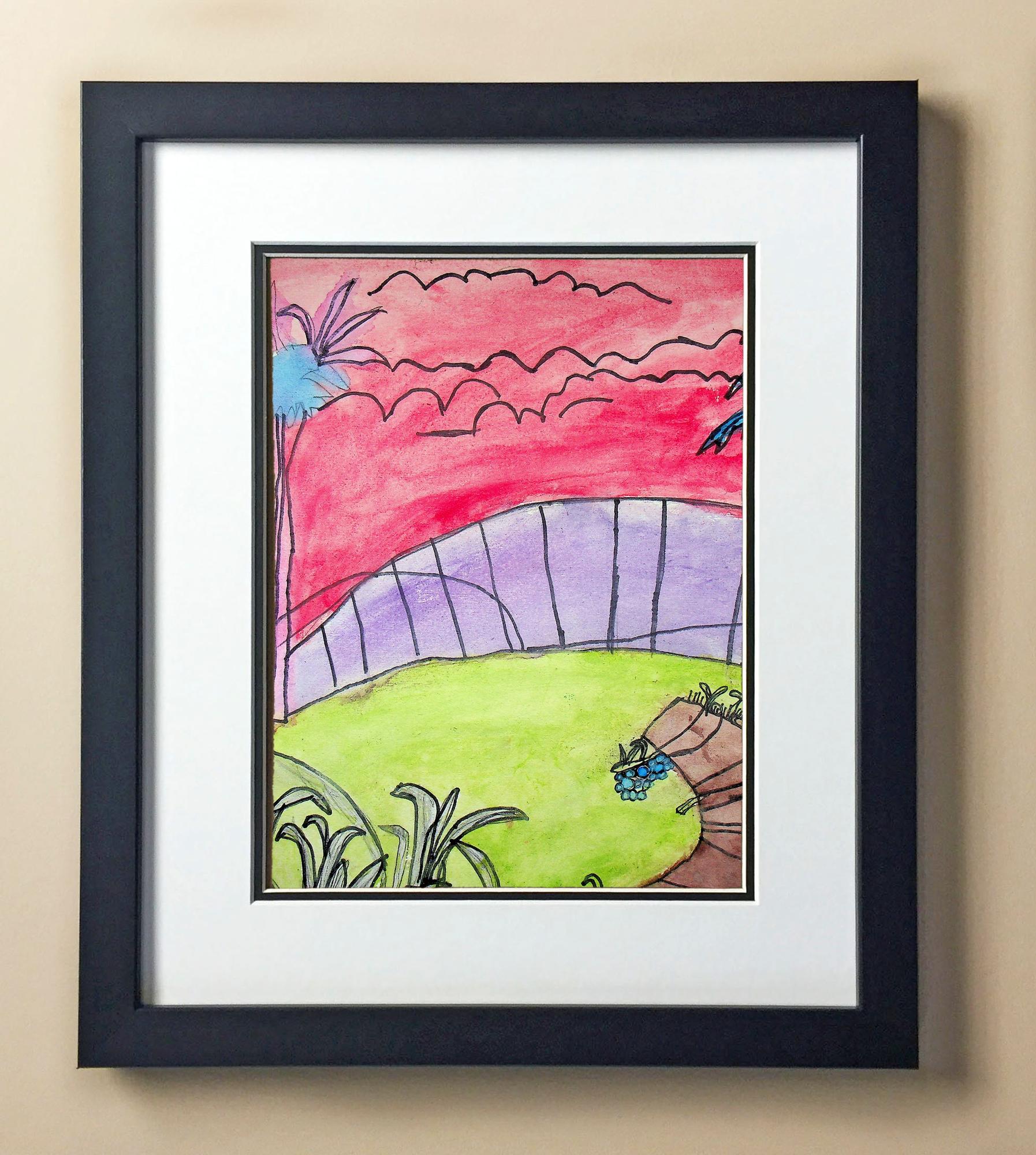 Included with the purchase is the Students Artwork, Frame, double matboard, shatter proof plexiglass, and a ready to hang backerboard with turnbuttons