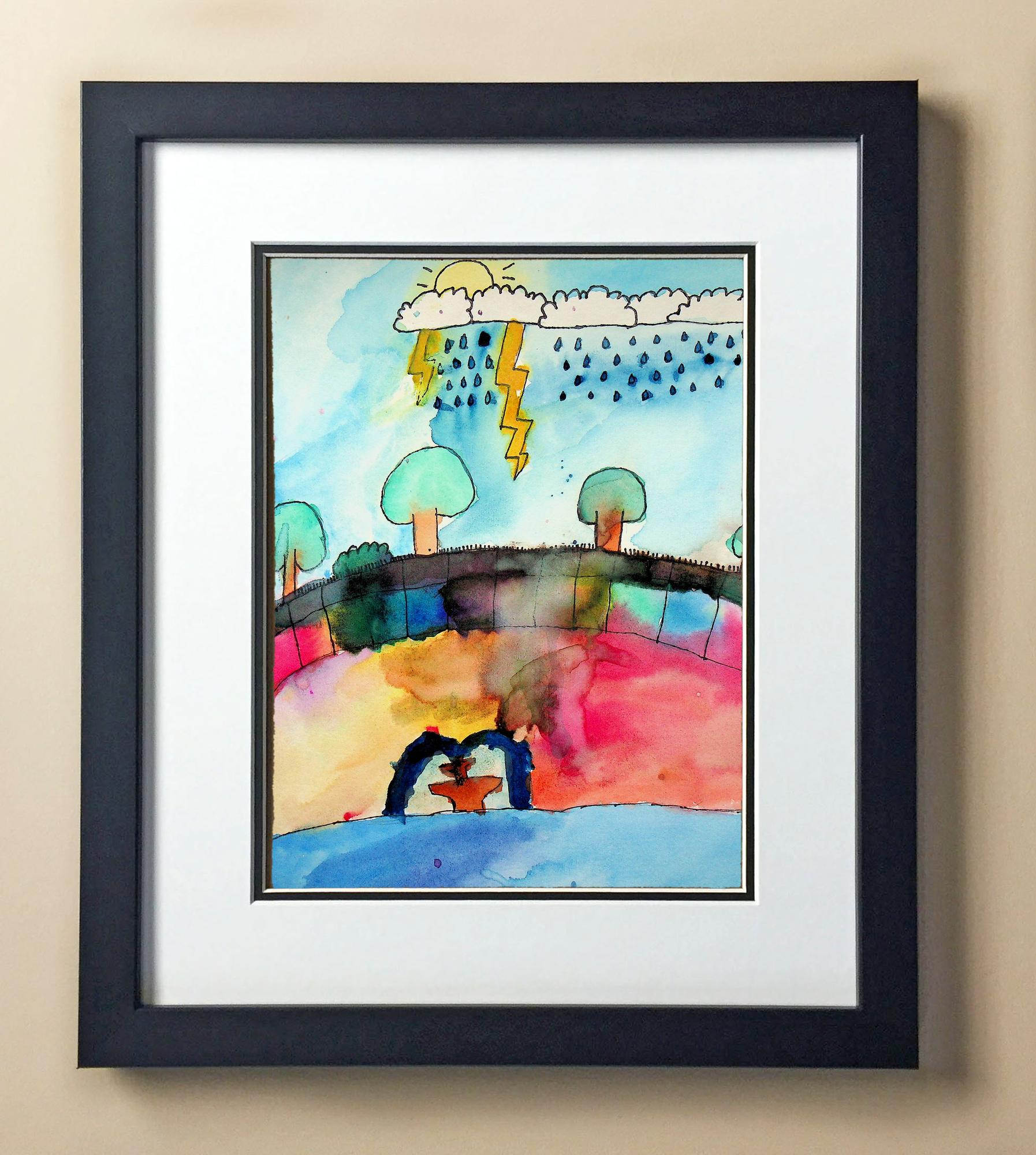 Included with the purchase is the Students Artwork, Frame, double matboard, shatter proof plexiglass, and a ready to hang backerboard with turnbuttons