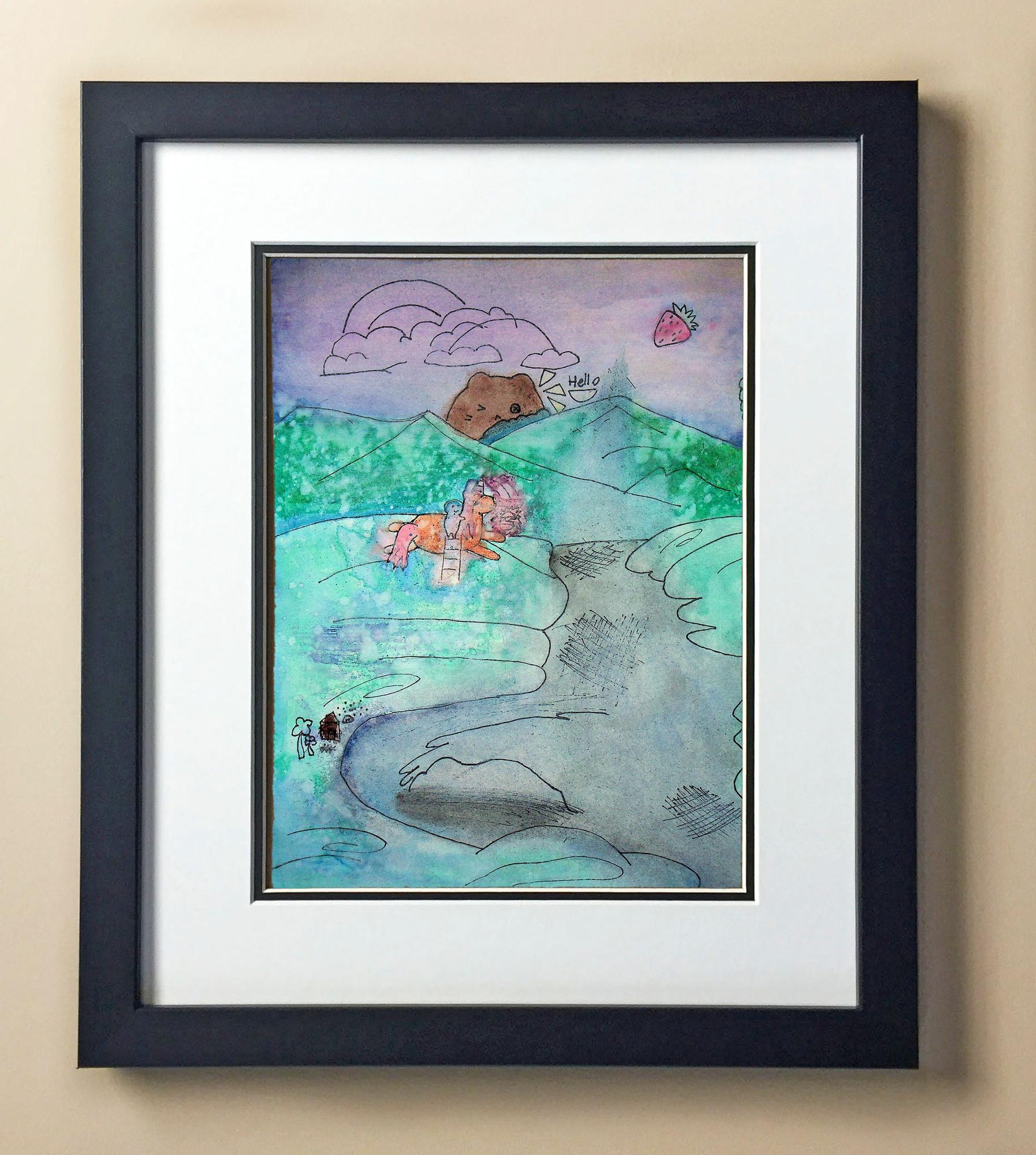 Included with the purchase is the Students Artwork, Frame, double matboard, shatter proof plexiglass, and a ready to hang backerboard with turnbuttons