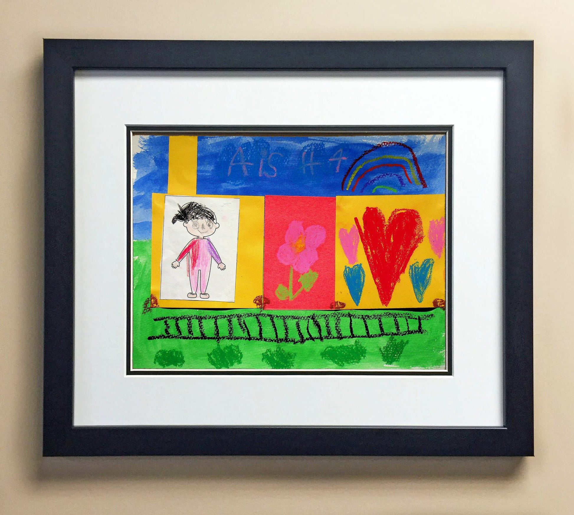Included with the purchase is the Students Artwork, Frame, double matboard, shatter proof plexiglass, and a ready to hang backerboard with turnbuttons