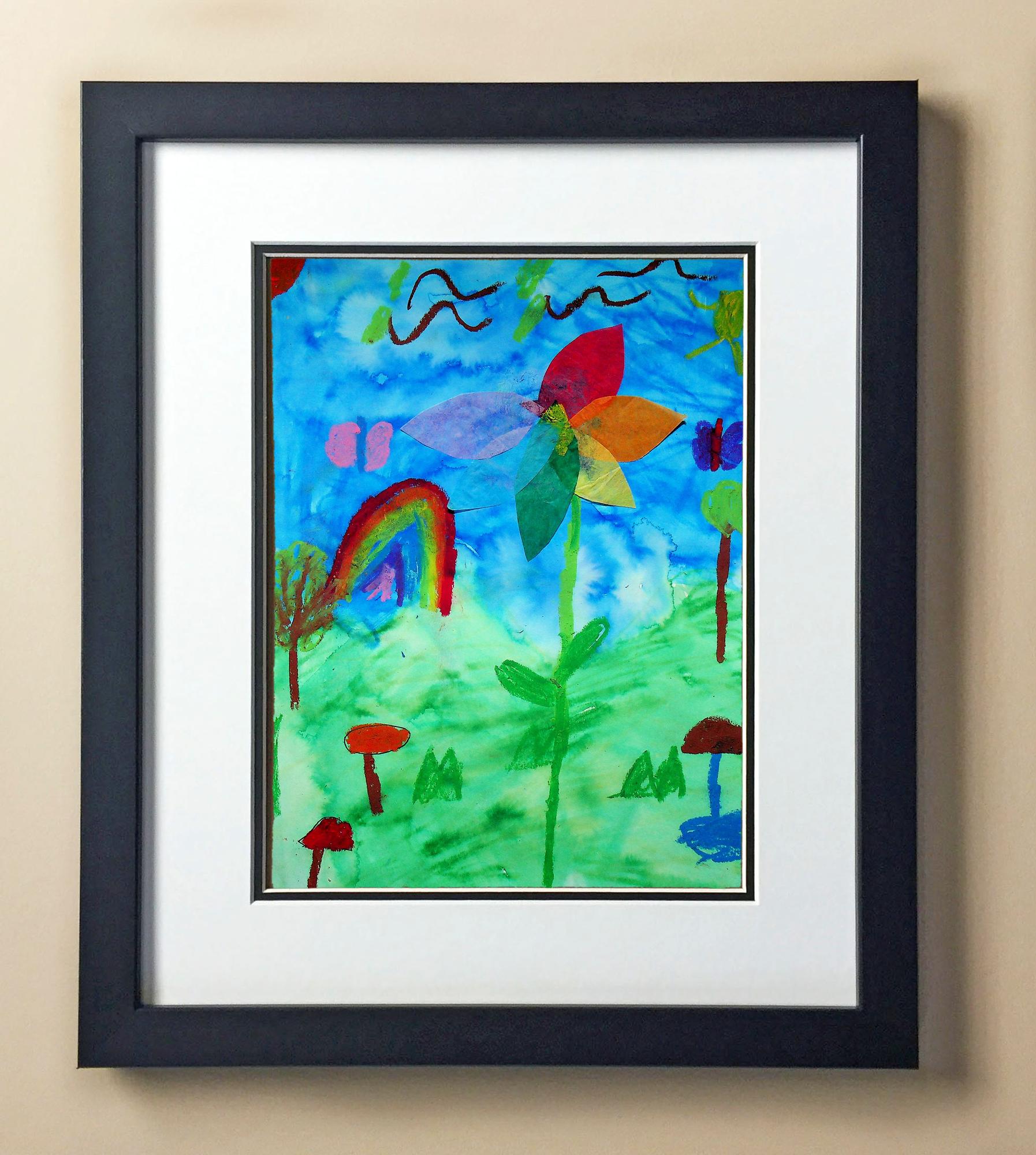 Included with the purchase is the Students Artwork, Frame, double matboard, shatter proof plexiglass, and a ready to hang backerboard with turnbuttons