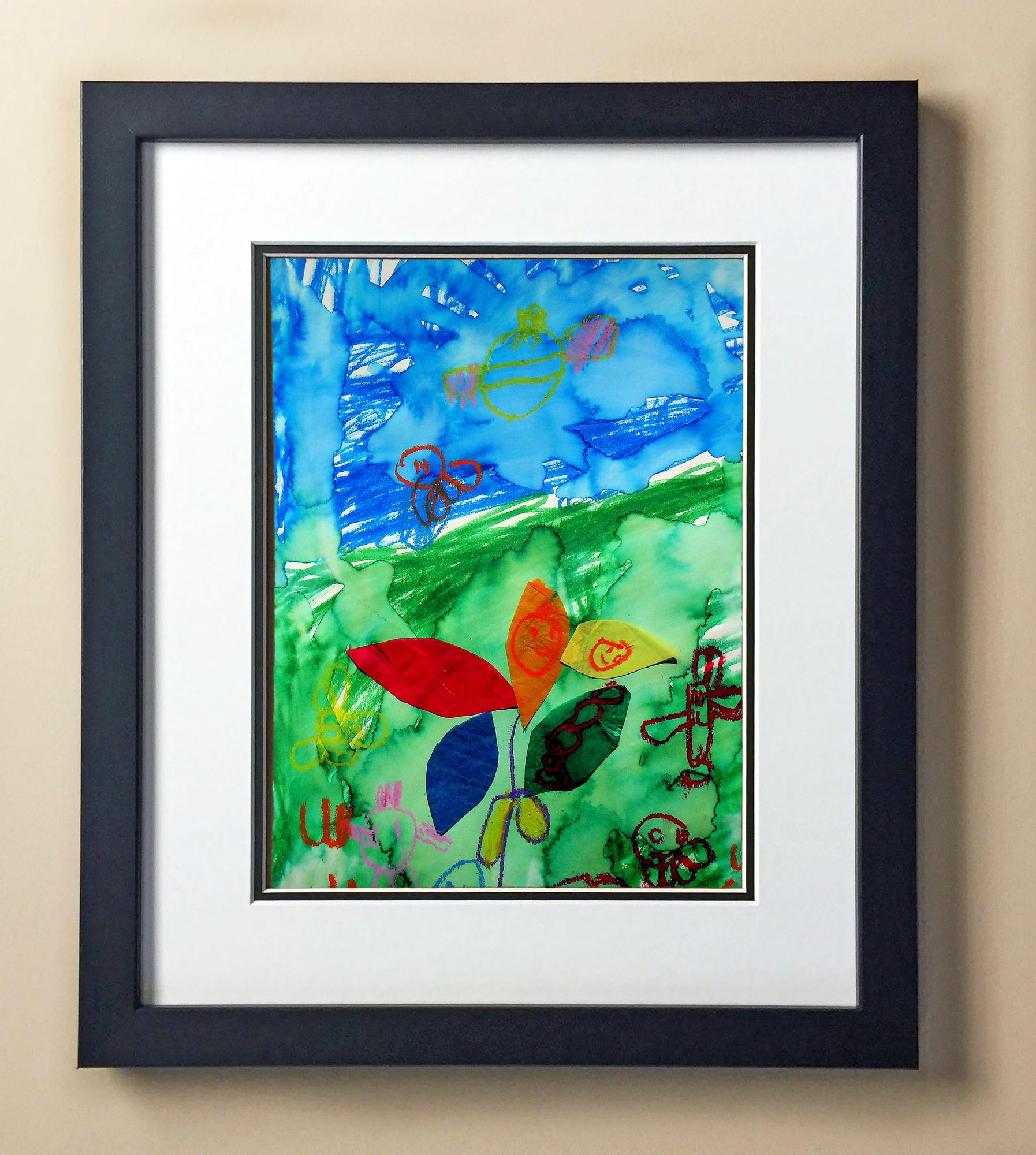 Included with the purchase is the Students Artwork, Frame, double matboard, shatter proof plexiglass, and a ready to hang backerboard with turnbuttons