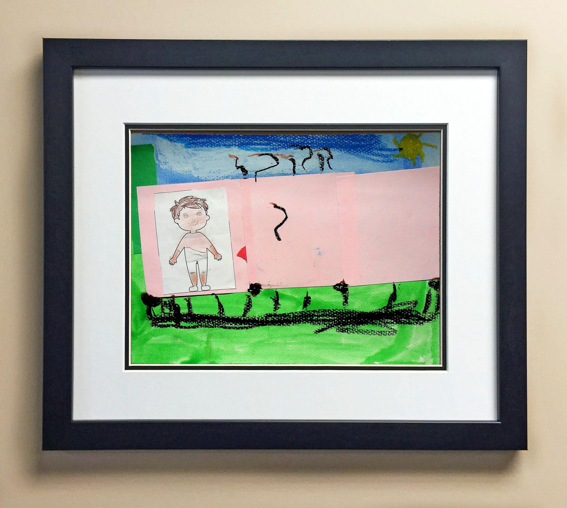 Included with the purchase is the Students Artwork, Frame, double matboard, shatter proof plexiglass, and a ready to hang backerboard with turnbuttons