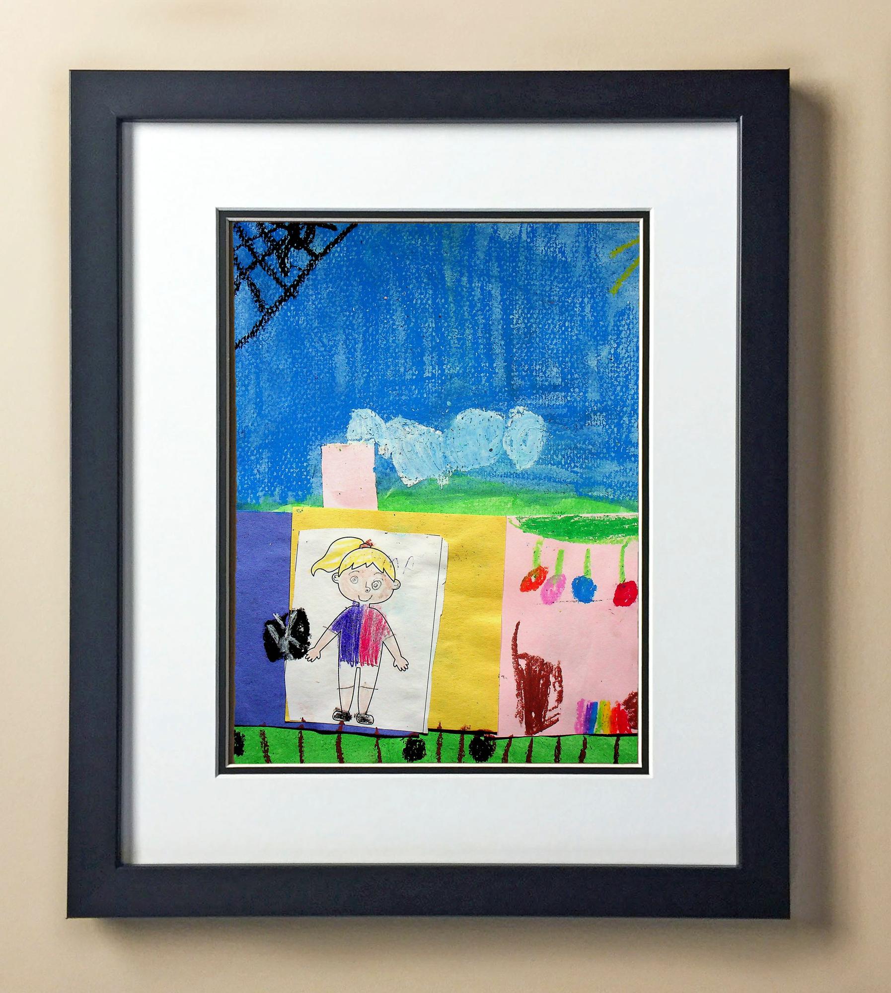 Included with the purchase is the Students Artwork, Frame, double matboard, shatter proof plexiglass, and a ready to hang backerboard with turnbuttons