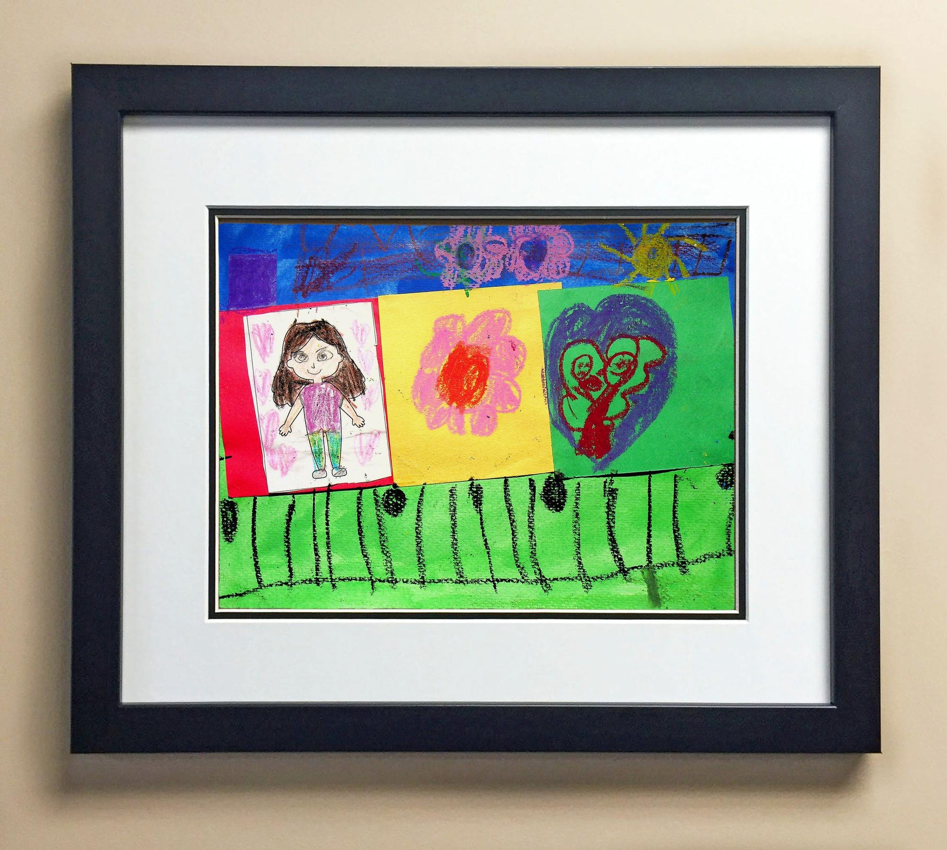 Included with the purchase is the Students Artwork, Frame, double matboard, shatter proof plexiglass, and a ready to hang backerboard with turnbuttons