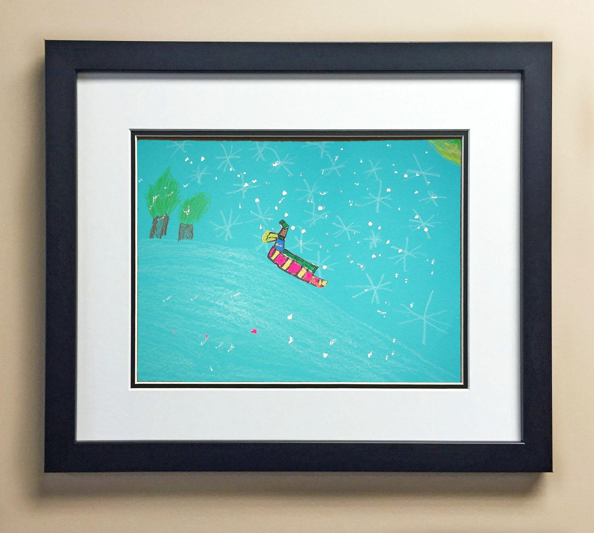 Included with the purchase is the Students Artwork, Frame, double matboard, shatter proof plexiglass, and a ready to hang backerboard with turnbuttons