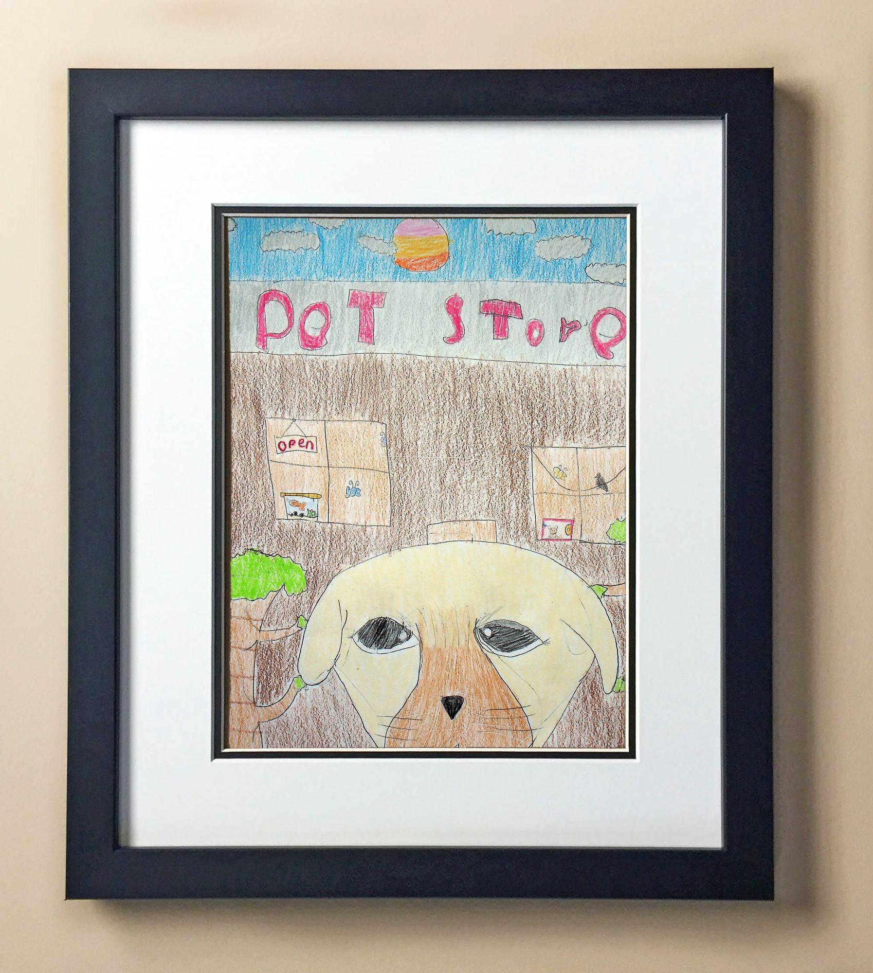 Included with the purchase is the Students Artwork, Frame, double matboard, shatter proof plexiglass, and a ready to hang backerboard with turnbuttons