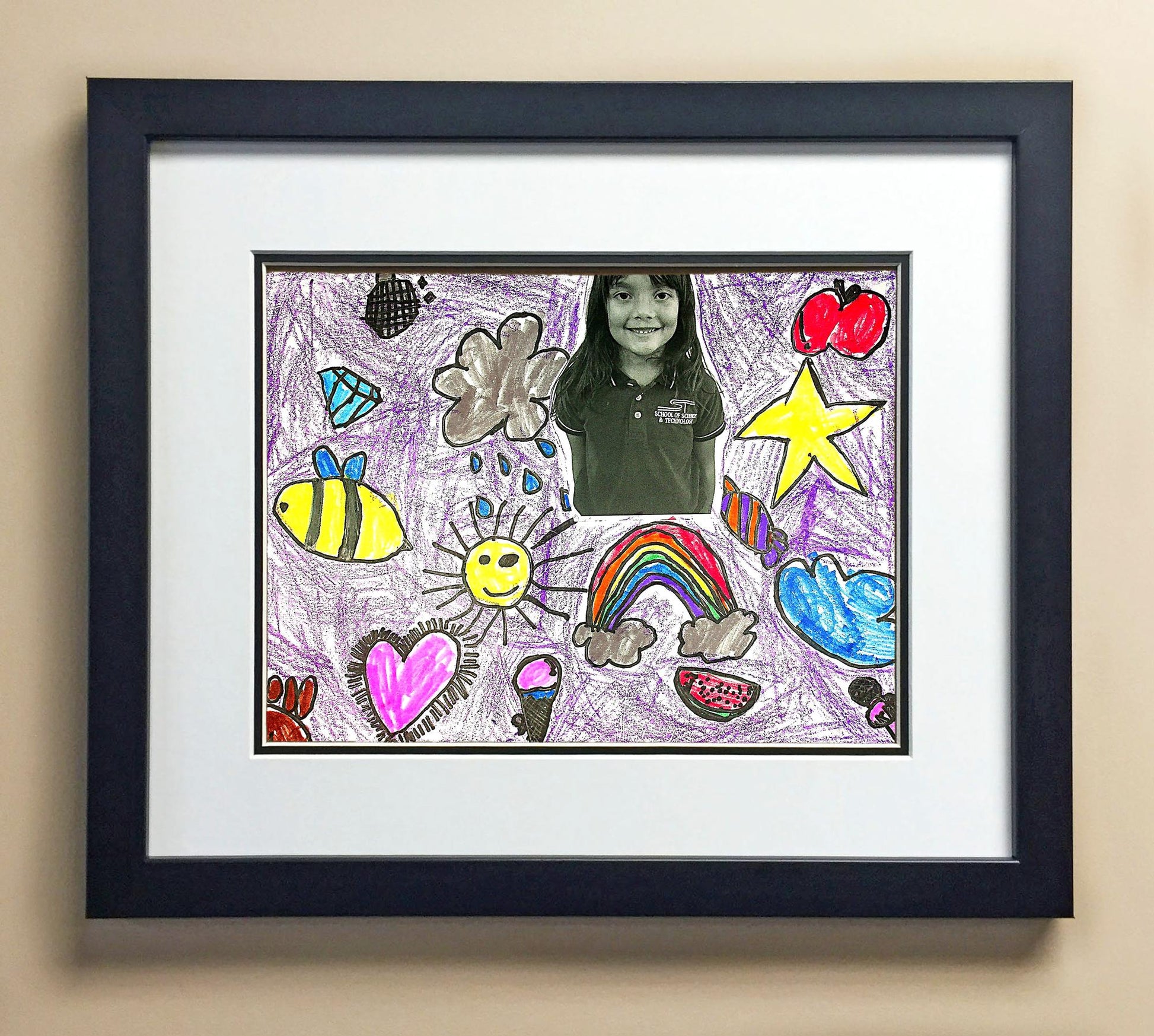 Included with the purchase is the Students Artwork, Frame, double matboard, shatter proof plexiglass, and a ready to hang backerboard with turnbuttons
