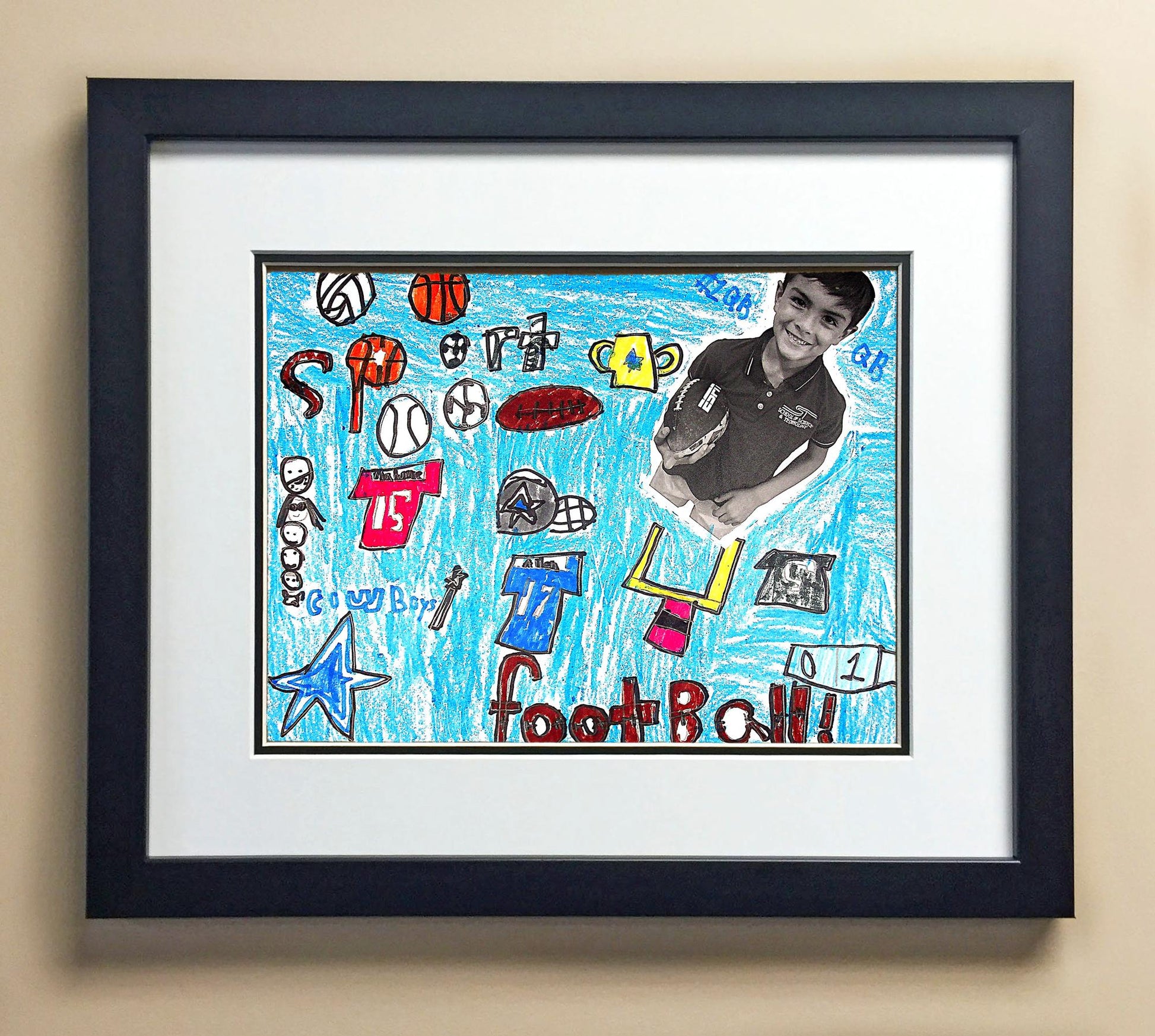 Included with the purchase is the Students Artwork, Frame, double matboard, shatter proof plexiglass, and a ready to hang backerboard with turnbuttons
