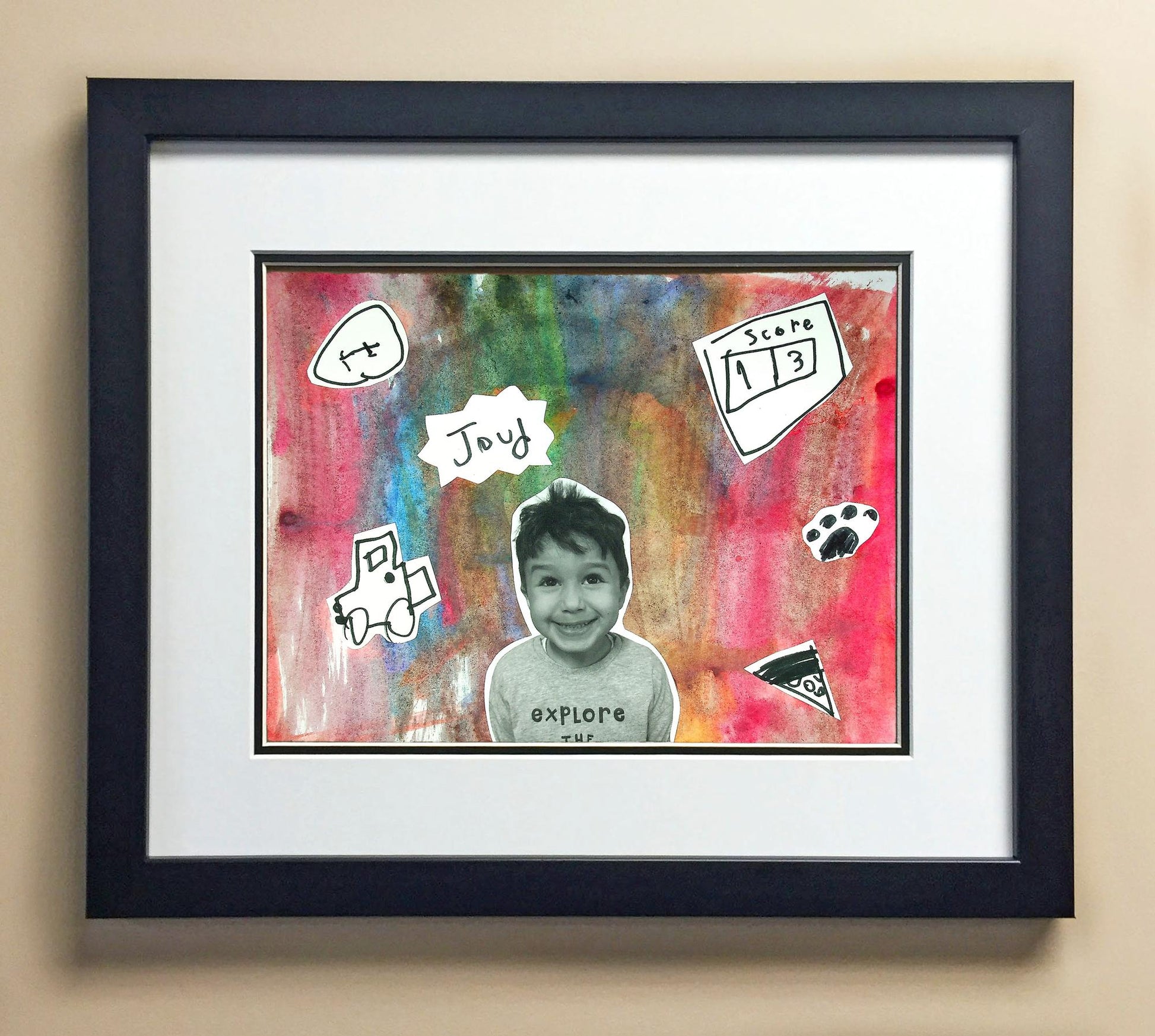 Included with the purchase is the Students Artwork, Frame, double matboard, shatter proof plexiglass, and a ready to hang backerboard with turnbuttons
