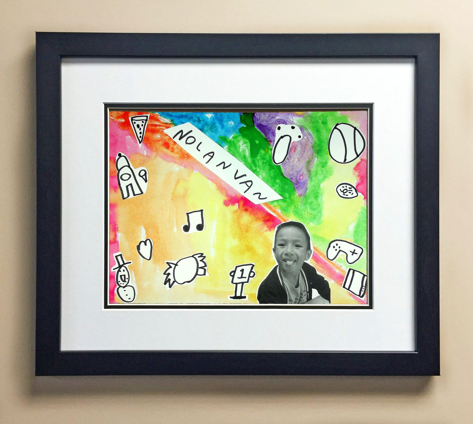 Included with the purchase is the Students Artwork, Frame, double matboard, shatter proof plexiglass, and a ready to hang backerboard with turnbuttons