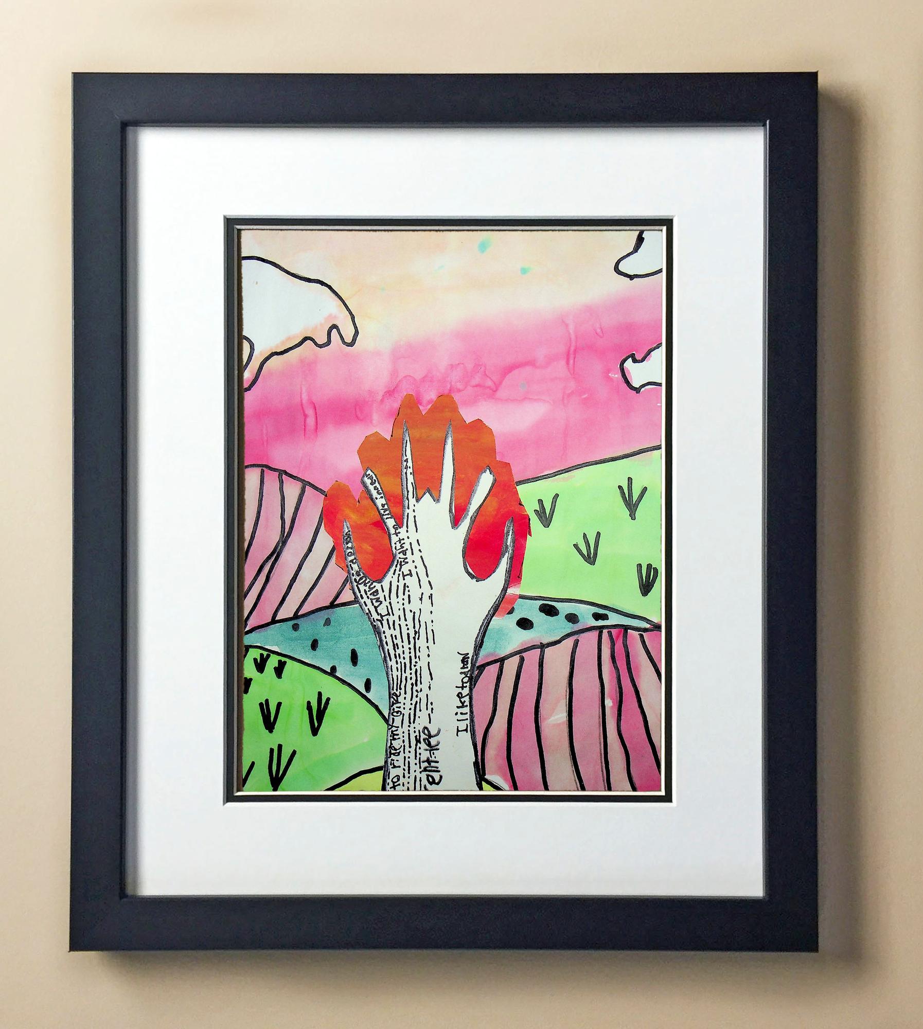Included with the purchase is the Students Artwork, Frame, double matboard, shatter proof plexiglass, and a ready to hang backerboard with turnbuttons