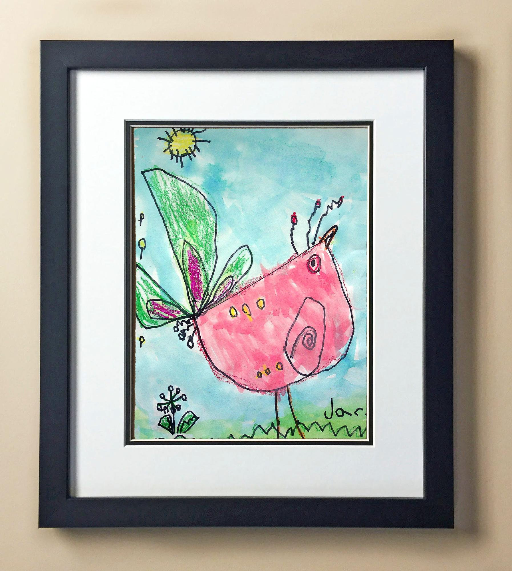 Included with the purchase is the Students Artwork, Frame, double matboard, shatter proof plexiglass, and a ready to hang backerboard with turnbuttons