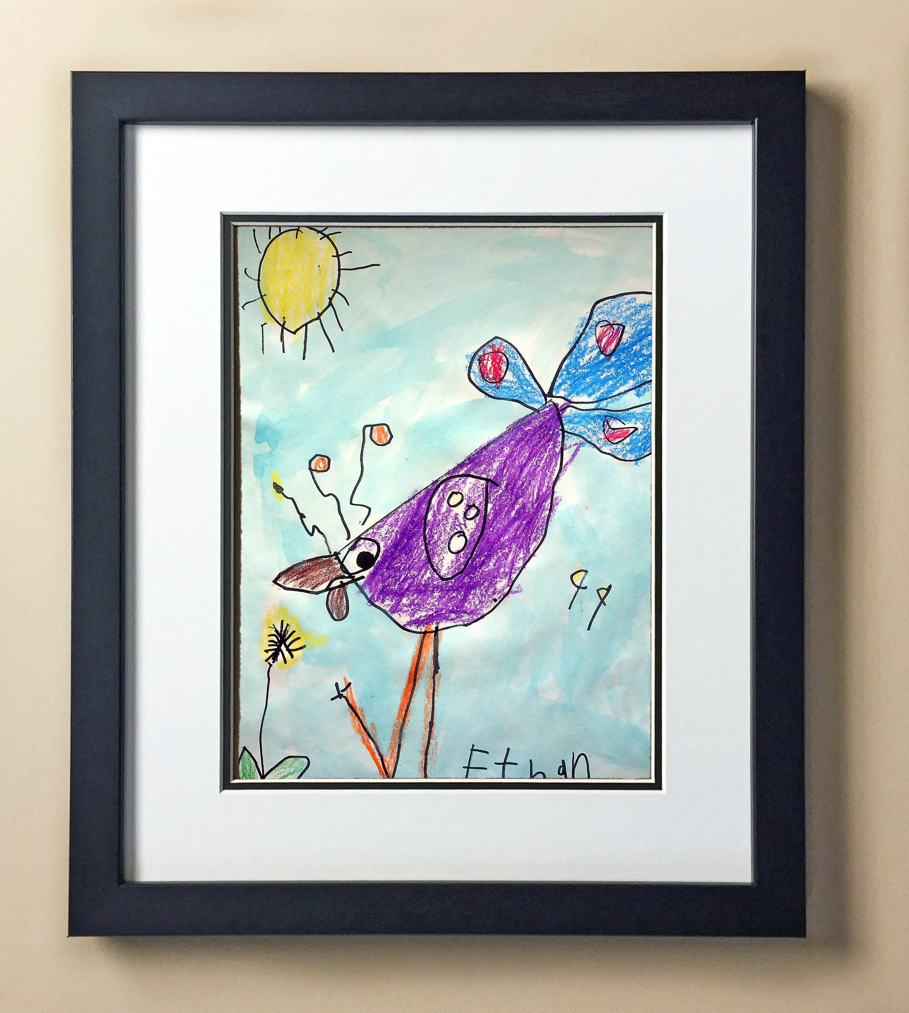 Included with the purchase is the Students Artwork, Frame, double matboard, shatter proof plexiglass, and a ready to hang backerboard with turnbuttons