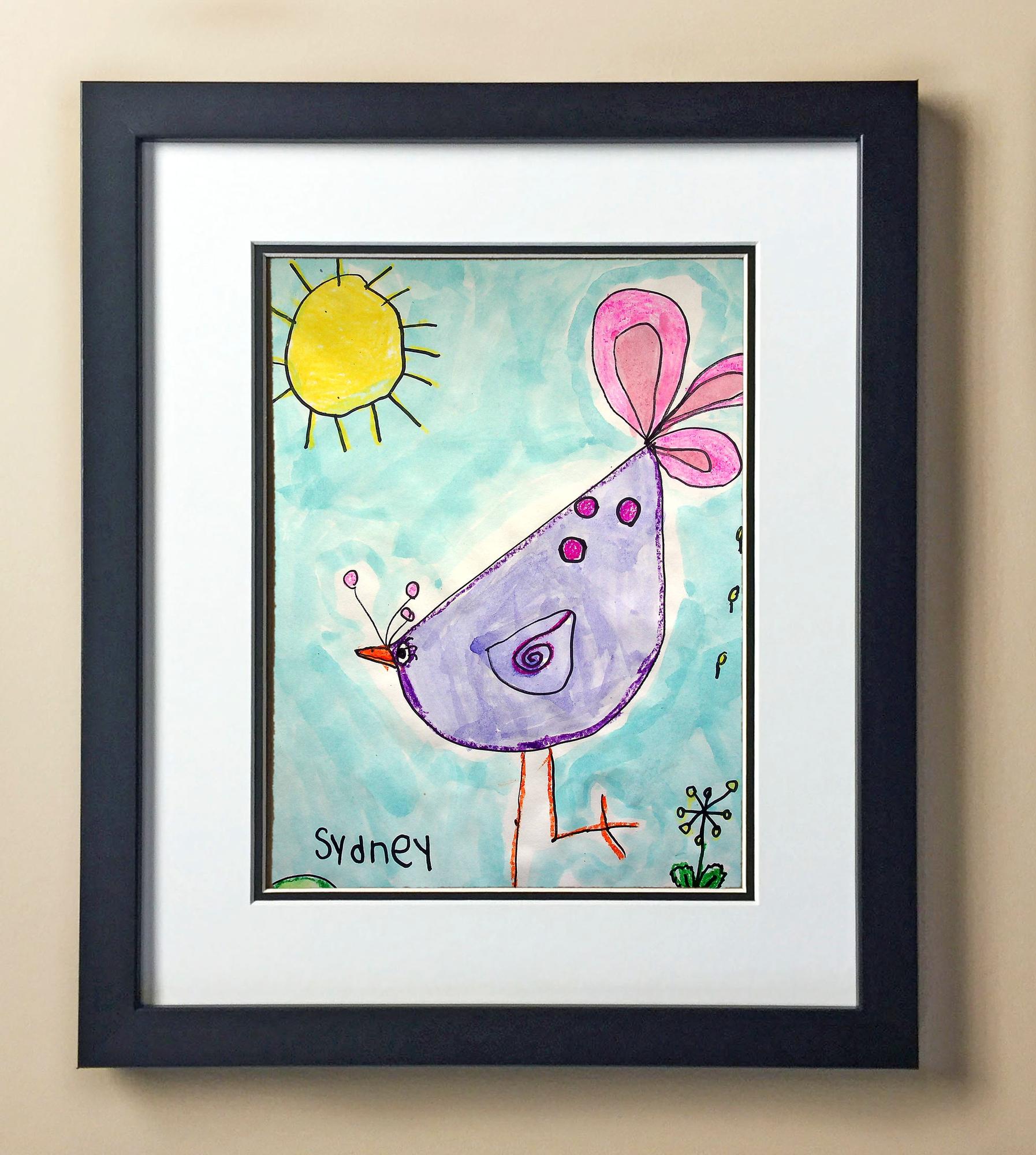 Included with the purchase is the Students Artwork, Frame, double matboard, shatter proof plexiglass, and a ready to hang backerboard with turnbuttons