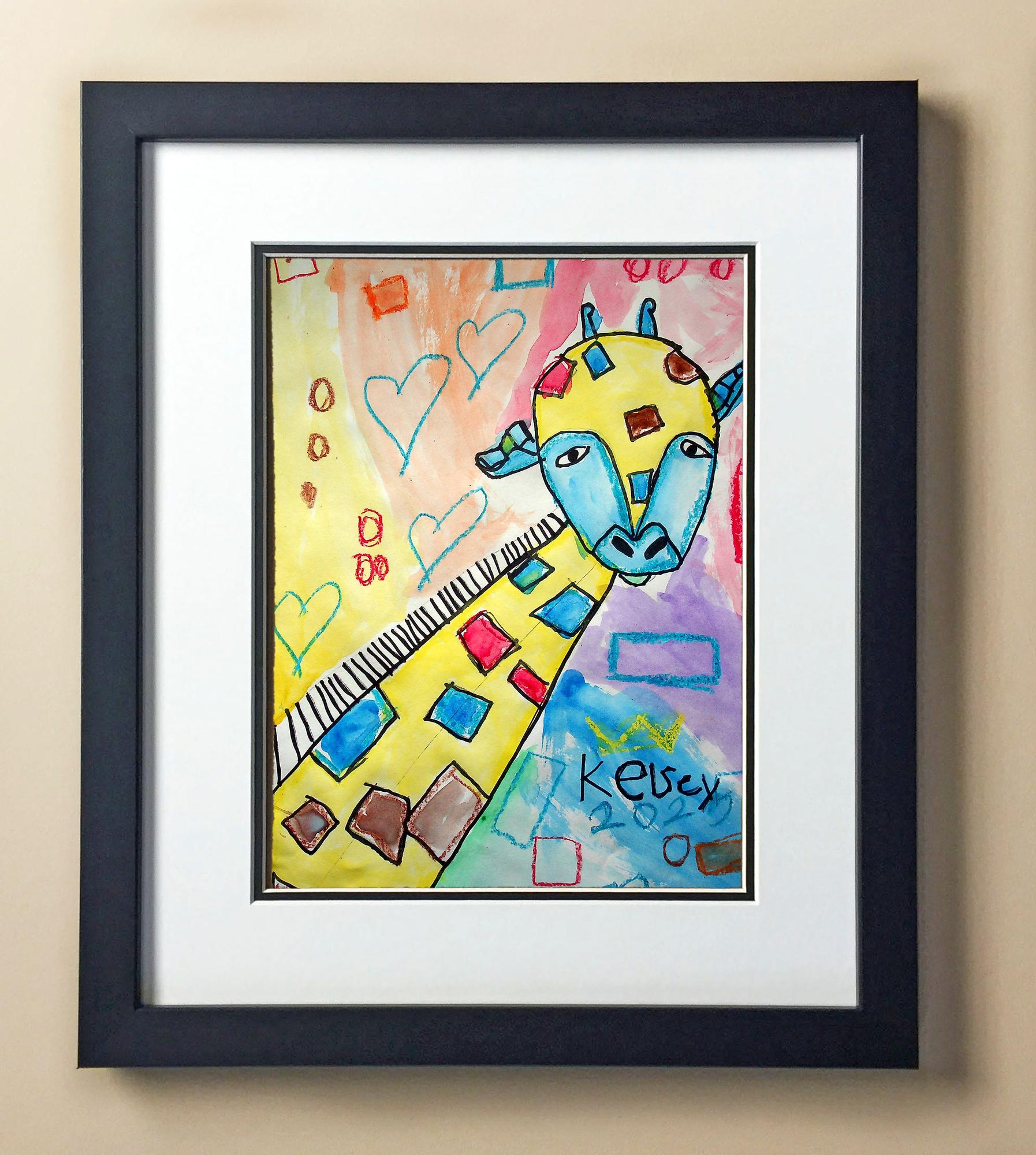 Included with the purchase is the Students Artwork, Frame, double matboard, shatter proof plexiglass, and a ready to hang backerboard with turnbuttons