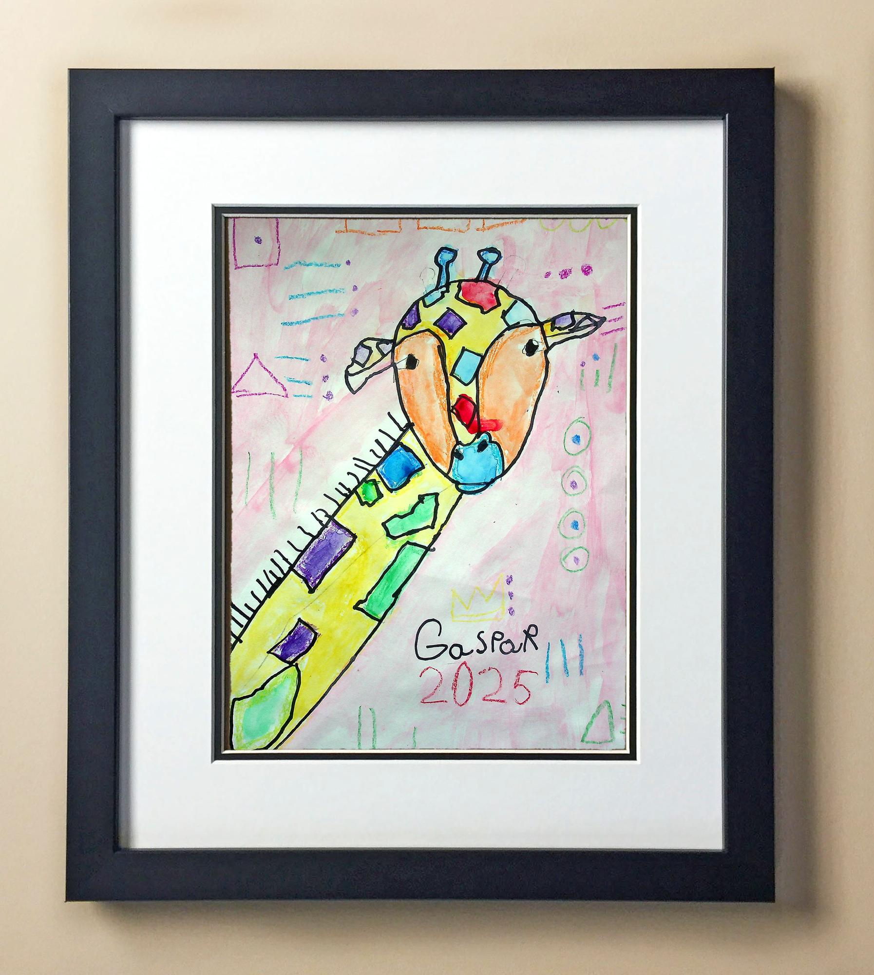 Included with the purchase is the Students Artwork, Frame, double matboard, shatter proof plexiglass, and a ready to hang backerboard with turnbuttons