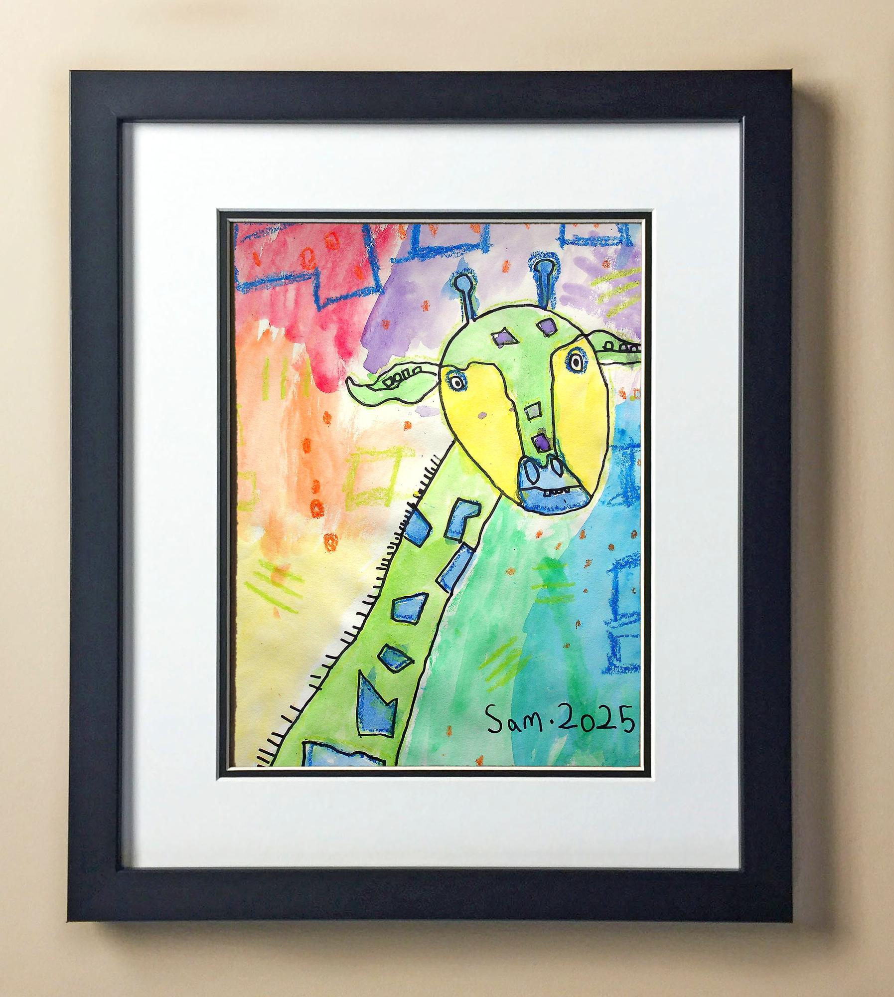 Included with the purchase is the Students Artwork, Frame, double matboard, shatter proof plexiglass, and a ready to hang backerboard with turnbuttons