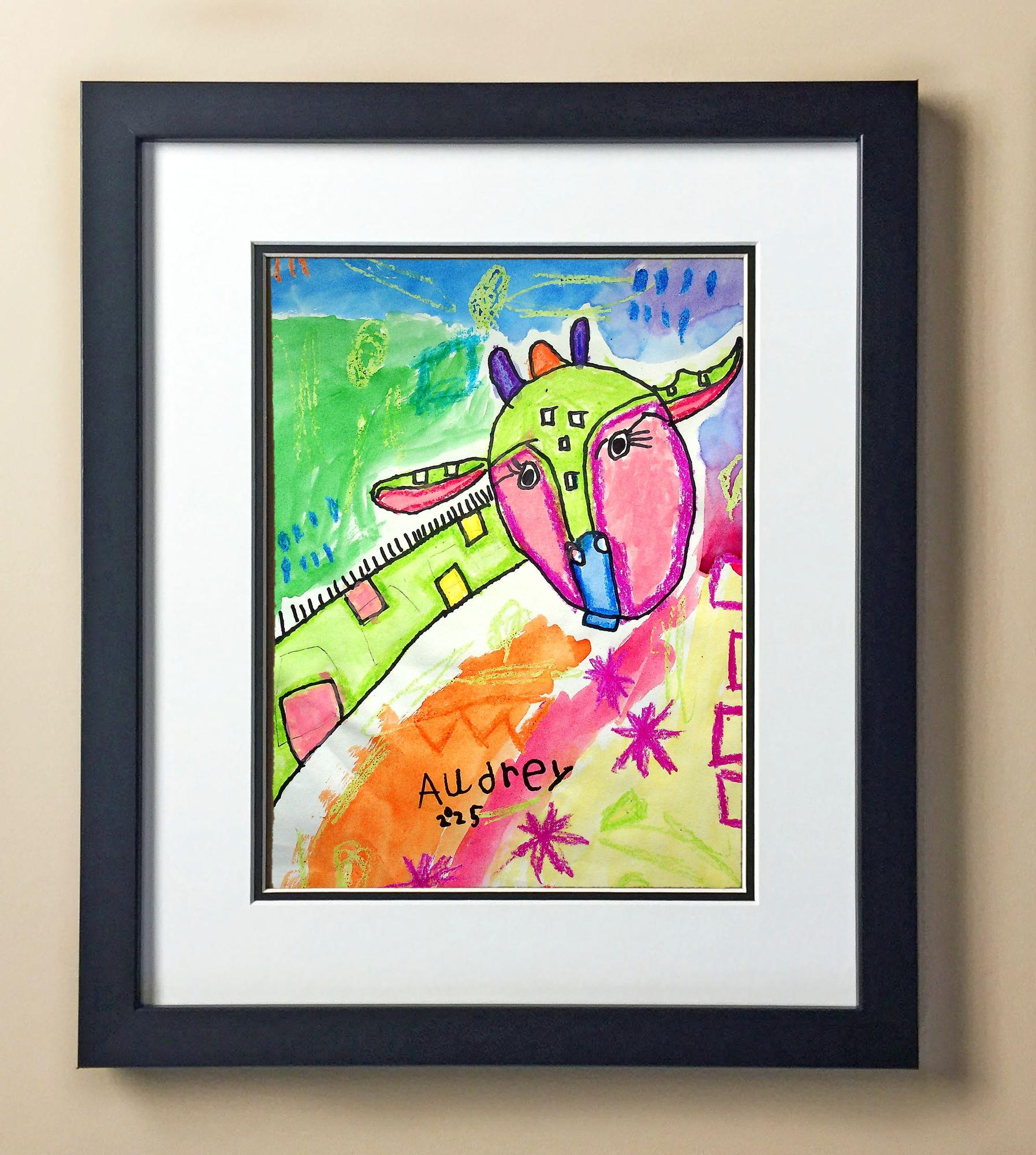 Included with the purchase is the Students Artwork, Frame, double matboard, shatter proof plexiglass, and a ready to hang backerboard with turnbuttons