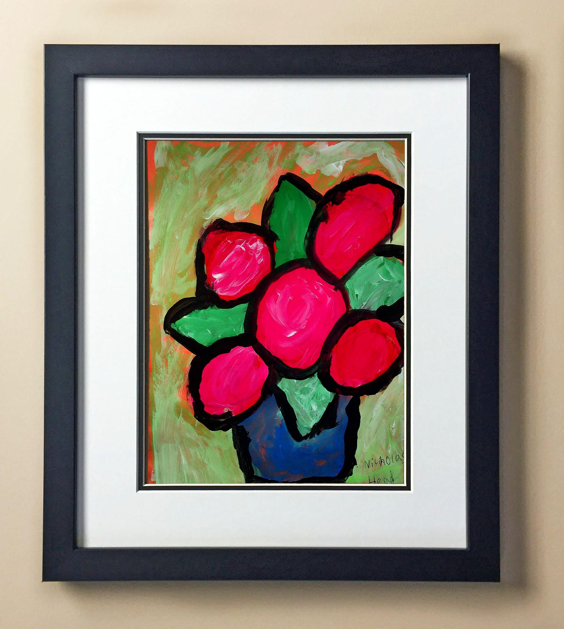 Included with the purchase is the Students Artwork, Frame, double matboard, shatter proof plexiglass, and a ready to hang backerboard with turnbuttons