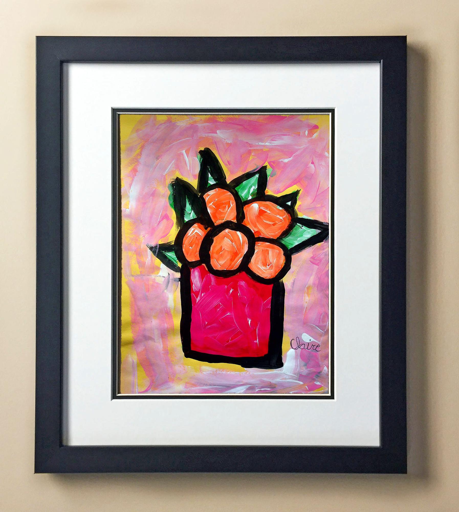 Included with the purchase is the Students Artwork, Frame, double matboard, shatter proof plexiglass, and a ready to hang backerboard with turnbuttons