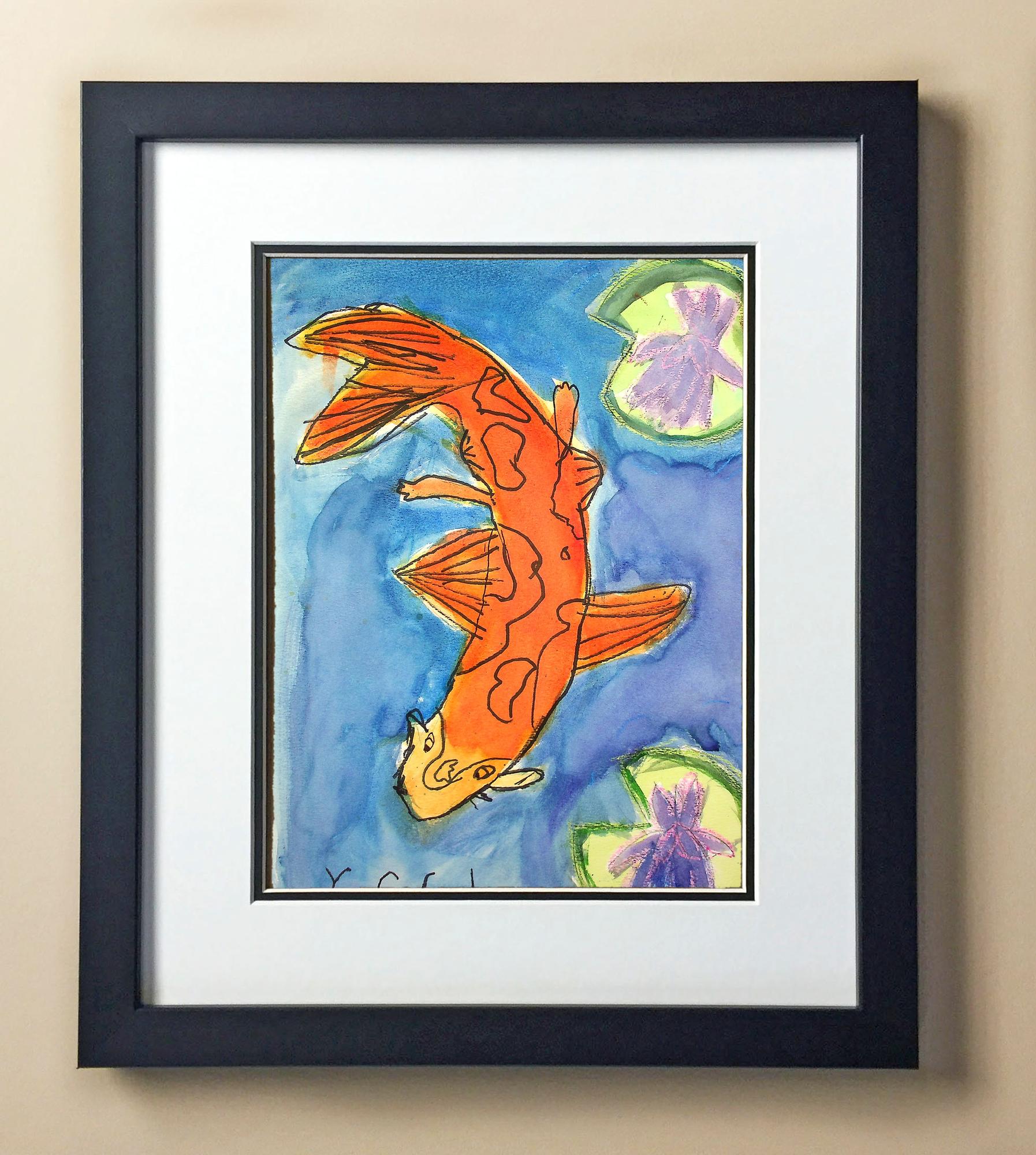 Included with the purchase is the Students Artwork, Frame, double matboard, shatter proof plexiglass, and a ready to hang backerboard with turnbuttons