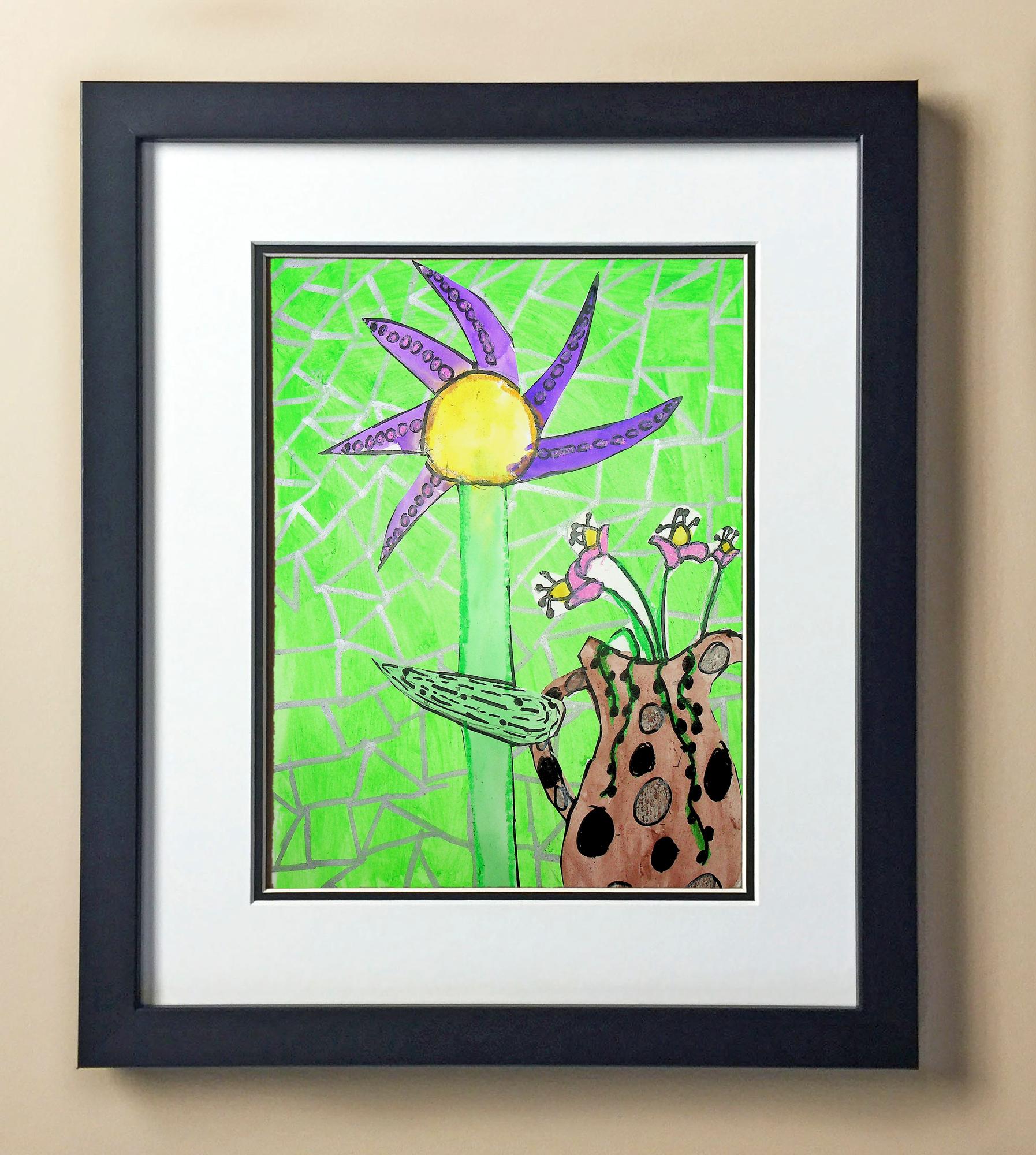Included with the purchase is the Students Artwork, Frame, double matboard, shatter proof plexiglass, and a ready to hang backerboard with turnbuttons